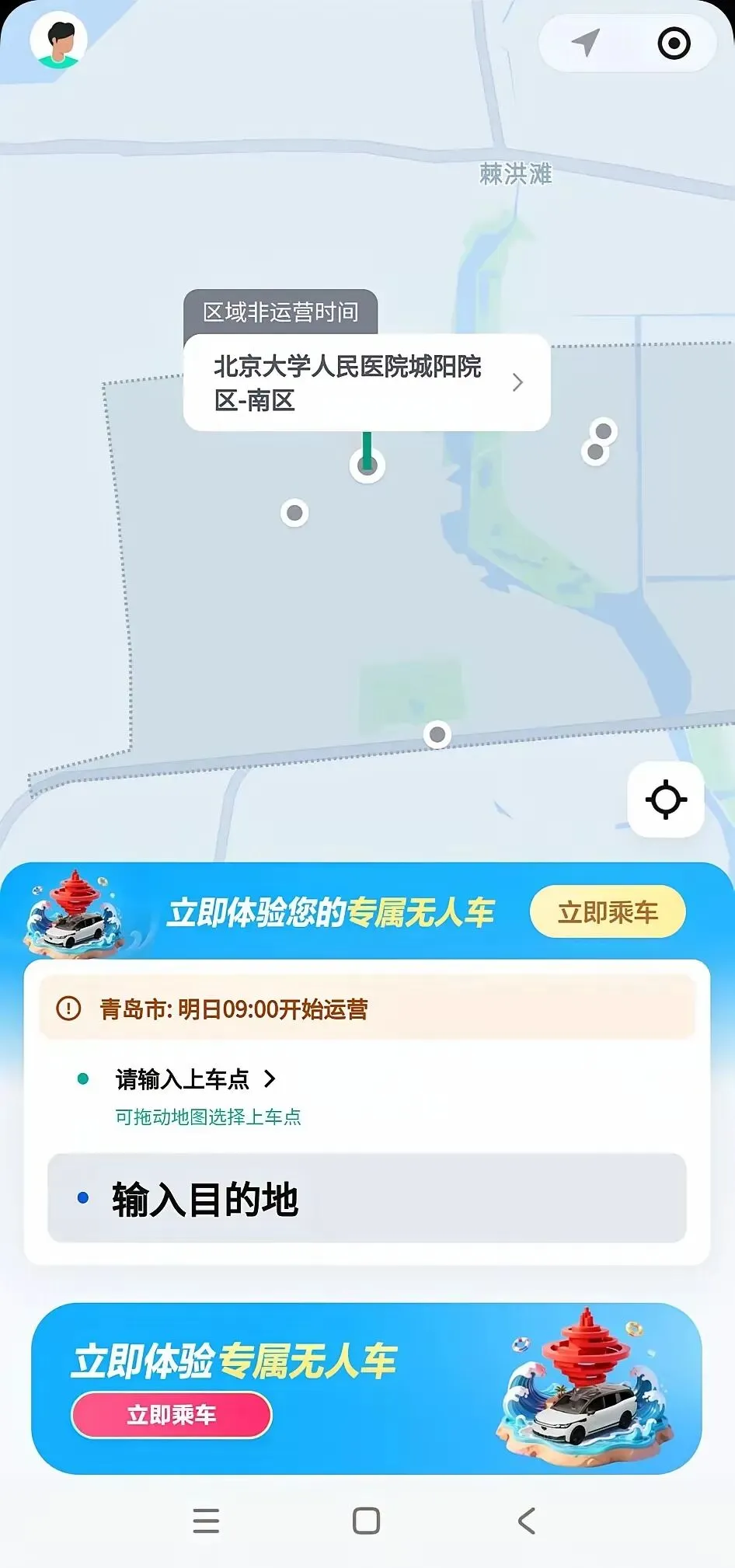 登录“萝卜快跑”客户端发现,其已在青岛划定运营区域,该区域大致为南至正阳路,北至科韵路附近,东至和源路,西至龙章路、锦盛四路附近,超出运营区域则提示“不在运营区域”。运营时间为上午9点开始。