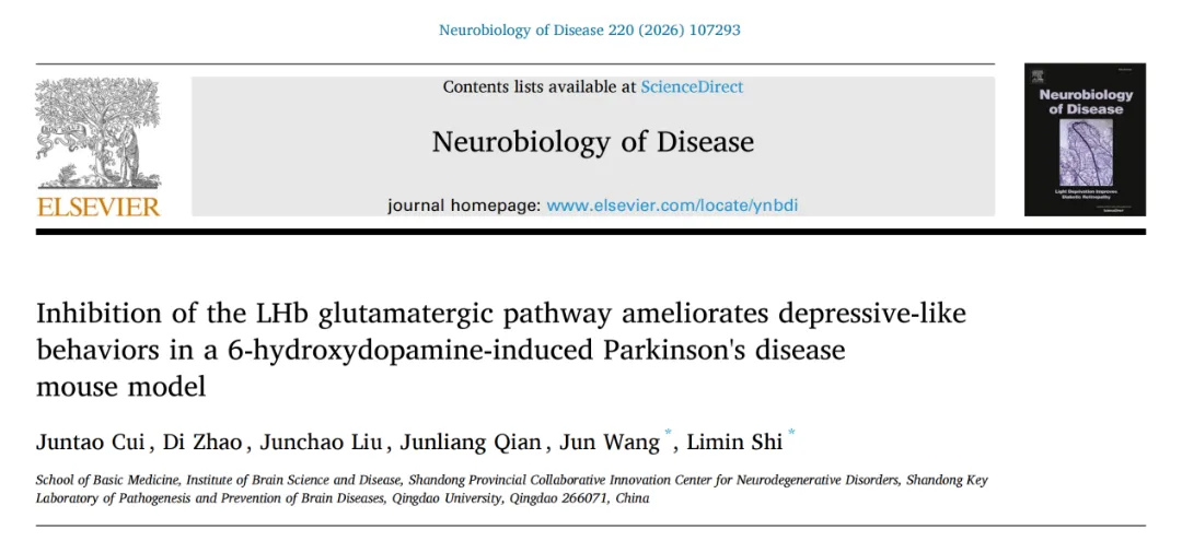 2026年1月,青岛大学石丽敏教授、王俊教授团队在Neurobiology of Disease上在线发表题为“Inhibition of the LHb Glutamatergic Pathway Ameliorates Depressive-like Behaviors in a 6-Hydroxydopamine-induced Parkinson's Disease Mouse Model”的最新研究成果,揭示通过抑制大脑中的LHb谷氨酸能通路,能够显著改善PD小鼠模型的抑郁样行为。这一发现为开发针对PD非运动症状的治疗策略提供了新思路。在此基础上,此前,团队于2025年8月在Neurobiology of Disease上发表了题为“Decoding the Dual Regulatory Systems: Contemporary Insights into the Lateral Habenula and Rostromedial Tegmental Nucleus Physiology”的综述,全面总结了LHb和RMTg在奖励处理、厌恶信号传递和情绪调节中的重要作用。这两项工作从具体的实验现象出发,逐步深入到神经环路的系统解析,为我们理解PD抑郁的机制提供了更全面的视角。(拓展阅读:石丽敏课题组相关研究进展,详见“逻辑神经科学”报道(点击阅读):iScience︱青岛大学谢俊霞/石丽敏团队揭示未定带参与帕金森病运动症状治疗的新机制)