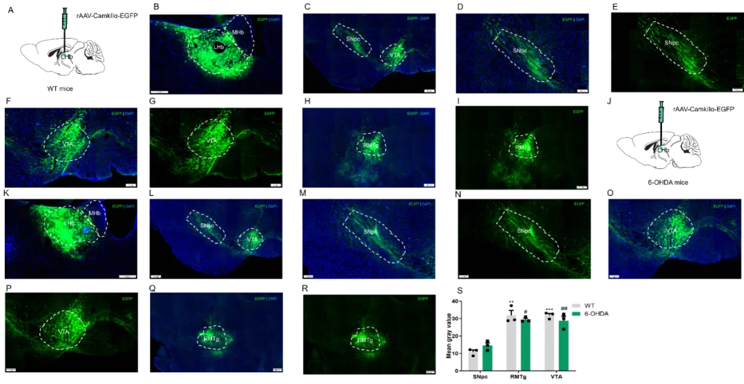 研究首先通过病毒追踪技术,可视化LHb在野生型(WT)和PD小鼠模型中的下游投射路径。结果显示,LHb的谷氨酸能神经元主要投射至RMTg和VTA,而在PD模型中这一通路的结构未发生显著改变(图1)。
