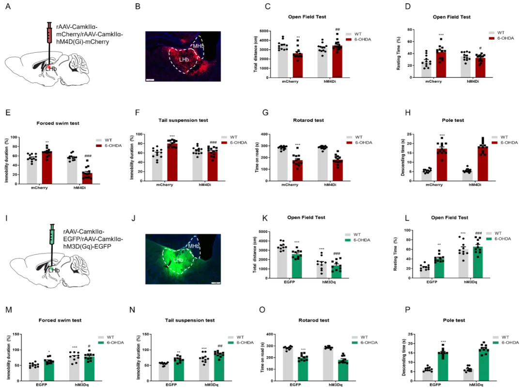 研究团队通过化学遗传学技术,在小鼠LHb中注射特定病毒,实现对其谷氨酸能神经元的抑制或激活。行为学测试(如强迫游泳实验、悬尾实验)结果显示,抑制LHb谷氨酸能神经元显著改善PD小鼠的抑郁样行为(如减少不动时间),但对WT小鼠无影响。激活LHb谷氨酸能神经元加剧WT和PD小鼠的抑郁样行为(图2)。
