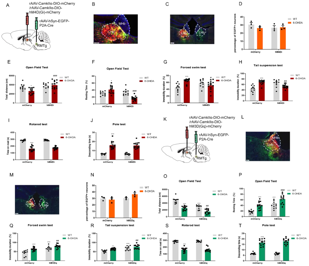 进一步研究发现,LHb通过RMTg间接调控情绪行为,而非直接作用于VTA。抑制LHb-RMTg通路缓解PD小鼠的抑郁样行为。激活LHb-RMTg通路加重抑郁行为。调控LHb-VTA通路未对抑郁行为产生显著影响(图3)。