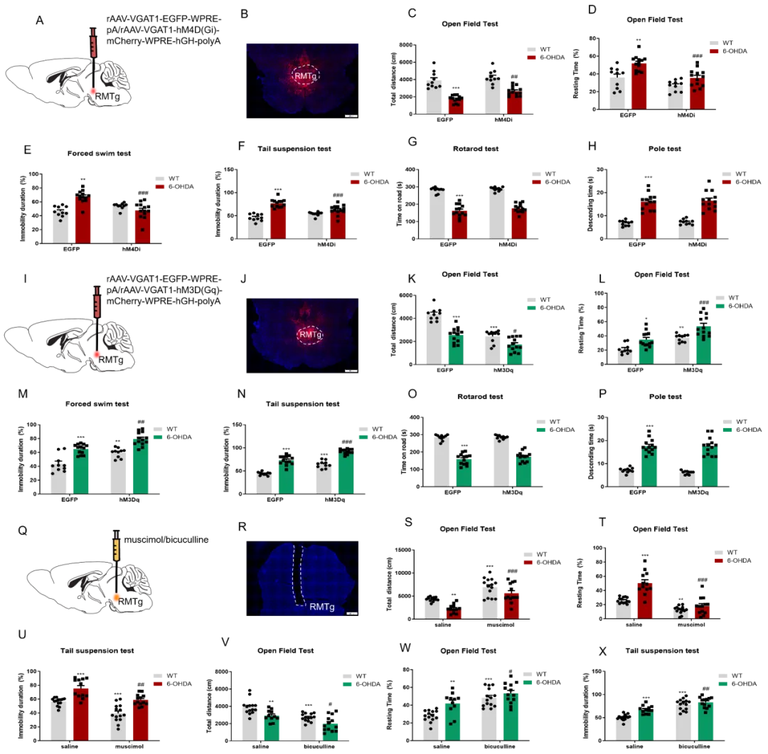 RMTg作为GABA能神经元富集区,是LHb下游的关键中继站。研究显示,抑制RMTg GABA能神经元,改善PD小鼠的抑郁样行为。激活RMTg GABA能神经元,加剧抑郁行为。药理学实验进一步验证了这一结果。向RMTg注射GABAA受体激动剂(Muscimol)可抑制神经元活动,缓解抑郁,而注射拮抗剂(Bicuculline)则加重抑郁(图4)。