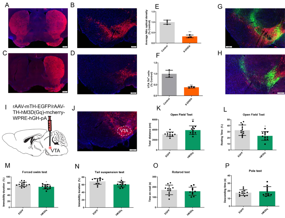 尽管LHb-VTA直接通路未显著影响抑郁行为,但研究团队发现直接激活VTA多巴胺神经元能够缓解PD小鼠的抑郁样行为。这表明多巴胺系统在动机和奖励行为中仍扮演重要角色(图5)。