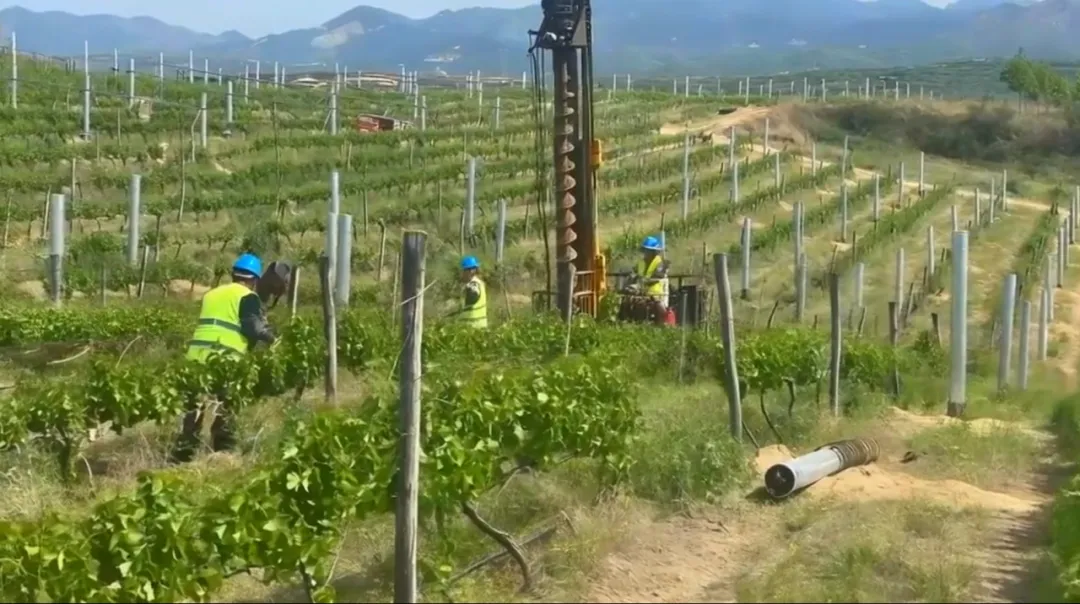 莱山项目作为农光互补项目,一部分光伏板需要铺设在葡萄地中。然而,葡萄沟的垄间距只有不到2米半,大型机械“束手无策”。团队凝聚智慧,改装了部分工具,用农用小型三轮车一趟趟运送水泥砂石,光伏板则依靠人工,肩扛手抬,一块块搬到指定位置安装。那段时间,团队分工协作,抢晴天、战雨天,硬是在密集的葡萄架间,为1000余亩土地披上了“蓝色盔甲”。