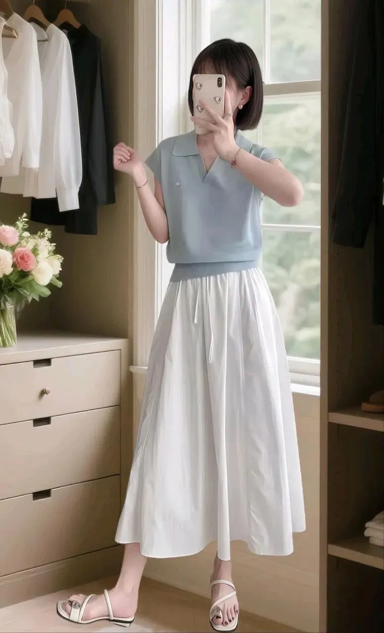白色无.袖衫.配深色.半裙,这组.合听着平.平无奇,关键在.一个动.作,把上衣塞.进裙腰。