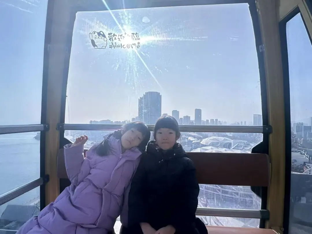 一圈转完,落地时仨娃还意犹未尽。妈妈牵着仨娃走在海边的步道上,海风拂过带着淡淡的咸,身后是缓缓转动的摩天轮,身前是蹦跳的娃们,孩子,海鸥与海浪声交织,成了冬日青岛海边最温暖的旋律。