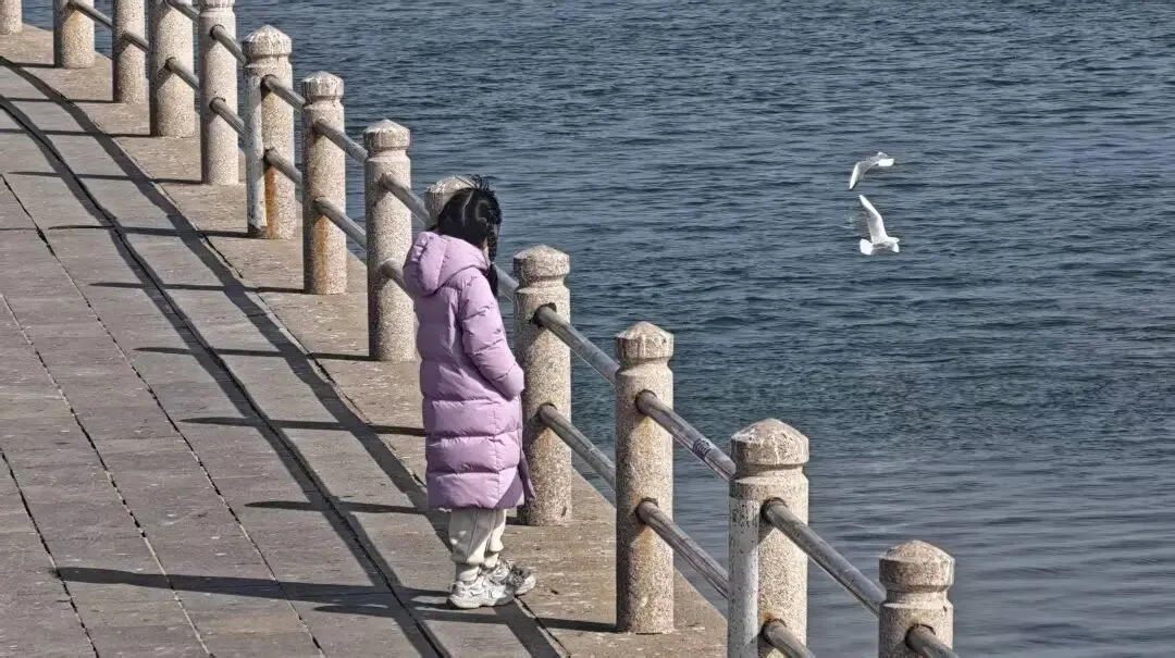 冬日的青岛,海信广场旁的海边风清天蓝,成群的海鸥绕着岸边翩飞,翅尖擦过波光,漾开细碎的银纹。四十岁的妈妈牵着仨娃,大的上五年级,还有表姐妹,叽叽喳喳的混着海风,撞出满溢的欢喜。