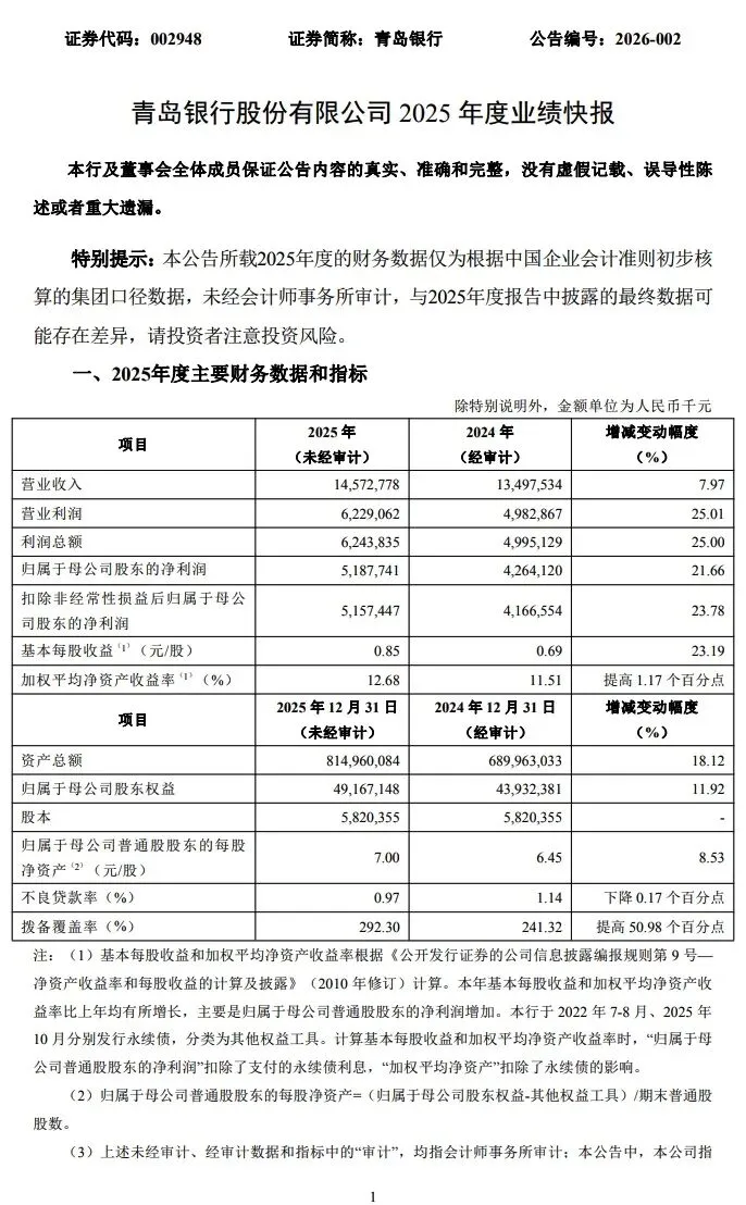 2026年1月28日,青岛银行披露2025年度业绩快报,恰逢“十四五”规划与该行三年战略规划收官之年,这份成绩单不仅勾勒出其全年经营全貌,也成为区域城商行在行业调整周期中发展的一个缩影。财鲸眼认为,依托扎根本地、服务实体的核心定位,以及“专业提升、数智赋能、体系优化、特色驱动”的经营思路,青岛银行2025年在规模、盈利、资产质量等核心指标上实现稳步提升,展现出一定的经营韧性;同时,作为区域城商行,其发展也面临行业共性挑战,整体呈现“稳步向好、仍有提升空间”的发展态势,后续表现需结合行业环境理性看待。