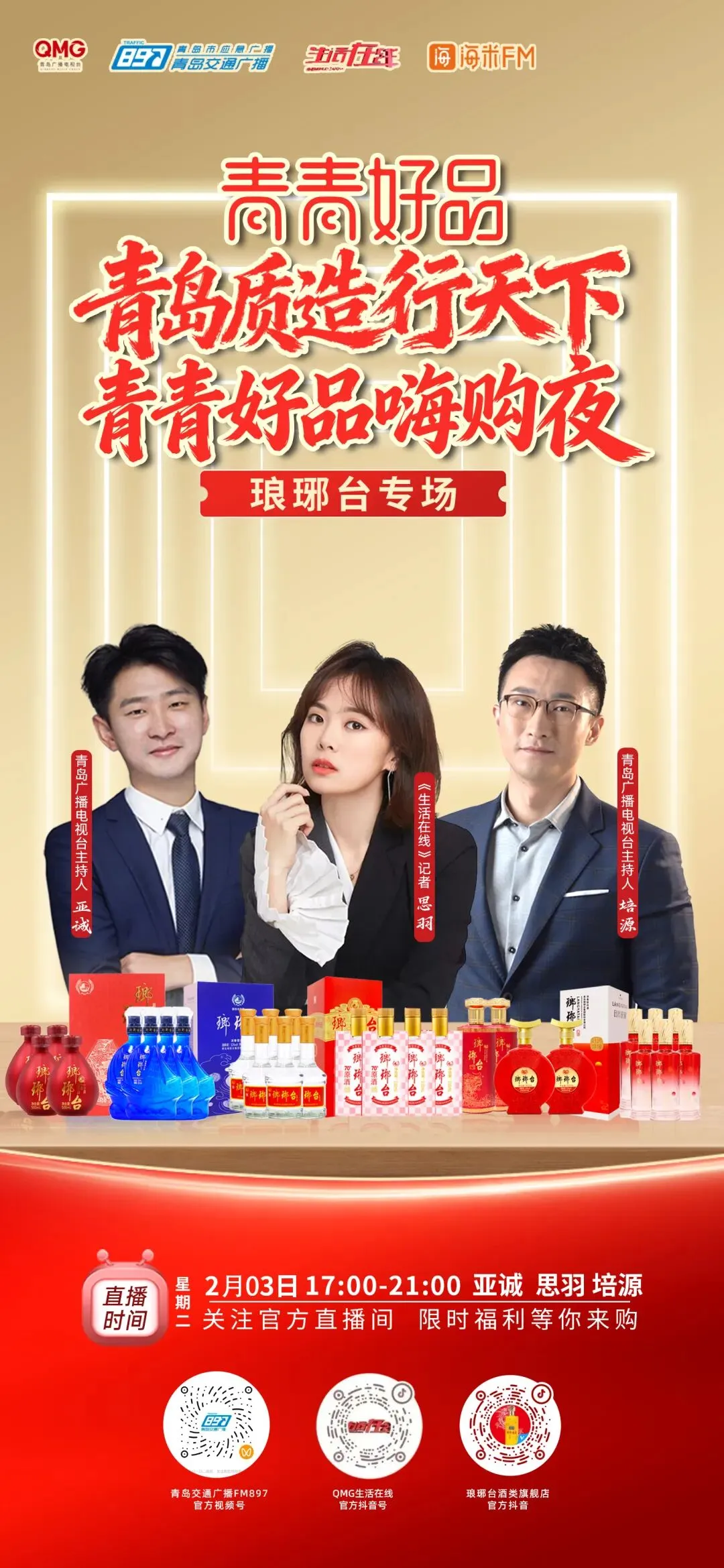 “青岛质造行天下”春季行动持续升温,新一轮好品直播接力登场! 今天(2月3日,周二)下午5点,“青青好品主理人”再度集结!交通广播主持人亚诚与《生活在线》主持人培源、记者陈思羽联袂登场,走进琅琊台集团,为家乡酿造的实力好物倾情代言! 本次直播将带您深入领略琅琊台的品牌魅力,从经典佳酿到创新产品,主播们将与您分享每一瓶酒背后的匠心故事与品质坚守。 观看平台: 青岛交通广播FM897视频号 QMG生活在线抖音号 从“青岛质造”的集体亮相到单个品牌的深度推介,我们正一步步将城市的品质与诚意,透过屏幕传递给您。这不仅是一次购物体验,更是一场关于信任与陪伴的对话。 今天下午5点,锁定直播间,与我们共品匠心,支持青岛质造!我们尊重原创,也注重分享。本公众号未注明来源的稿件,均为青岛电视台内部版权,若需转载请联系我们;其它凡本公众号注明“来源”的作品、图片,均转载自其他媒体、网络,转载目的在于传递更多信息,仅供学习参考之用,版权归原作者所有,禁止用于商业用途,如无意中侵犯您的知识产权,请联系删除,本公众平台将不承担任何责任。