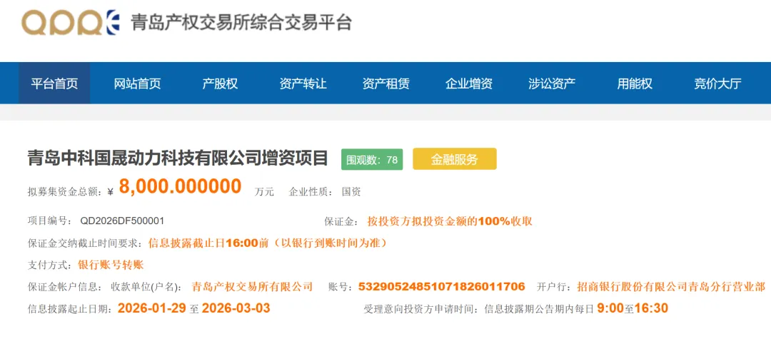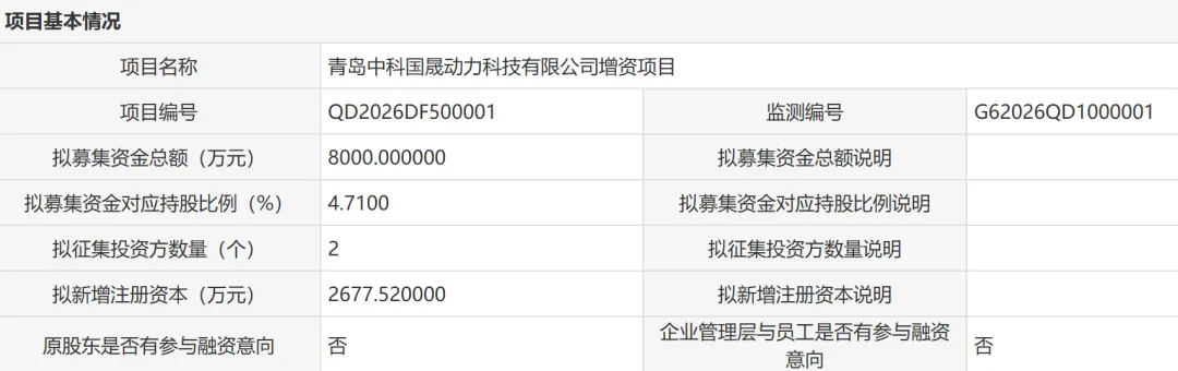 近日,青岛产权交易所综合交易平台发布青岛中科国晟动力科技有限公司增资项目,拟募集资金总金额8000万元,对应持股比例4.71%,拟征集投资方数量2个,拟新增注册资本2677.52万元。信息披露起止日期为2026年1月29日至2026年3月3日,本次增资行为决策及批准单位为青岛西海岸新区融合控股集团有限公司。在公开挂牌公告期内有符合条件的投资方摘牌,投资方数量不超过2家,每家投资金额不低于5000万元,总投资金额不低于5000万元,增资达成。募集资金用途为:1. 产品研发:含低排放燃机、低热值燃料发电燃机,及不同应用场景的配套动力涡轮、控制系统及成套产品研发;2. 生产制造:含已交付产品应付货款及新投产零件预付款、原材料采购、产品制造及试验等;3. 条件能力建设:用于支付园区建设一期项目尾款和二期建设费用、增添设备、工装(扩充生产线)及信息化建设;4. 市场开拓:主要为渠道建立及渠道拓展;5. 运营资金:主要为人力资源成本及日常运营费用。公告中表述:2025年9月29日青岛中科国晟动力科技有限公司启动挂牌交易程序,拟募集资金2亿元,挂牌期间募集到投资金额为1.2亿元,目前正在成交过程中。 鉴于增资拟募集资金为2亿元,尚有8000万元资金可补充募集,现启动再次挂牌交易程序,拟募集金额为8000万元人民币,最终投资方投资金额及投资股权比例以签署的《增资协议》为准。从财务数据来看,青岛中科国晟动力科技有限公司2022年度营业收入698.37万元,净利润亏损3400.55万元;2023年度营业收入457.99万元,净利润亏损2892.56万元;2024年度营业收入573.97万元,净利润亏损2833.1万元;2025年截至11月30日营业收入8987.69万元,净利润亏损1881.84万元。经过检索,青岛西海岸新区滨海街道微信公众号“活力滨海”,2025年11月曾发布《滨海街道中科国晟跻身中国隐形独角兽企业500强,赋能先进制造高质量发展》一文,其中介绍:中科国晟成立于2017年,由中国科学院工程热物理研究所与青岛城发投资集团有限公司、青岛军民融合发展集团有限公司共同发起成立。公司自成立以来,始终专注于20-50MW轻型燃气轮机的研发与产业化,凭借其卓越的技术实力和创新能力,先后获得“高新技术企业”、青岛市“专精特新”中小企业、“创新型中小企业”、“青岛市雏鹰企业”、“青岛市新型研发机构”等多项荣誉称号。作为国内轻型燃气轮机领域的领军企业,中科国晟以硬核技术打破国外垄断,彰显民族制造实力。公司自主研发的TG30系列燃气轮机实现100%自主化量产,沿用航空发动机设计理念,80%结构与航空发动机基本一致,兼具功率密度大、起动快、效率高、排放低等显著优势,代表我国轻型燃气轮机先进水平。2025年6月份,国际市场首台30MW燃气轮机发电机组及成套系统销售订单完成出厂交付,为海外市场拓展积累了实践经验。