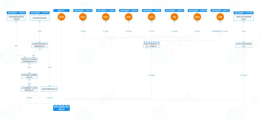 青岛中科国晟动力科技有限公司大股东为城发投资集团有限公司,持股比例31.2063%,通过股权穿透来看,青岛市黄岛区财政局通过山东融发腾达产业发展集团有限公司和城发投资集团有限公司间接持股,最终受益股份36.4549%,占比最高。
