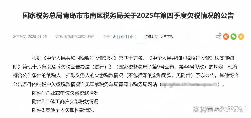 青岛市市南区税务局近日发布2025年第四季度欠税情况公告,通报辖区内存在欠税情形的企业共计799户。