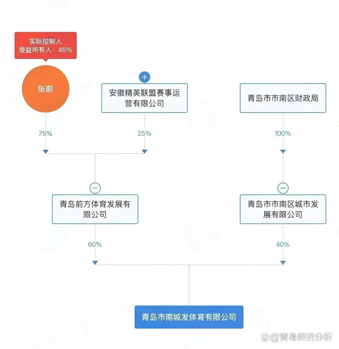 据公开信息显示,以上两家企业的注册地址均位于青岛市市南区东海中路2号9层。股权结构方面,青岛市南城发体育有限公司由青岛前方体育发展有限公司持股60%,剩余40%股份由青岛市市南区城市发展有限公司持有。后者为市南区属国有企业,实际控制人为市南区财政局。