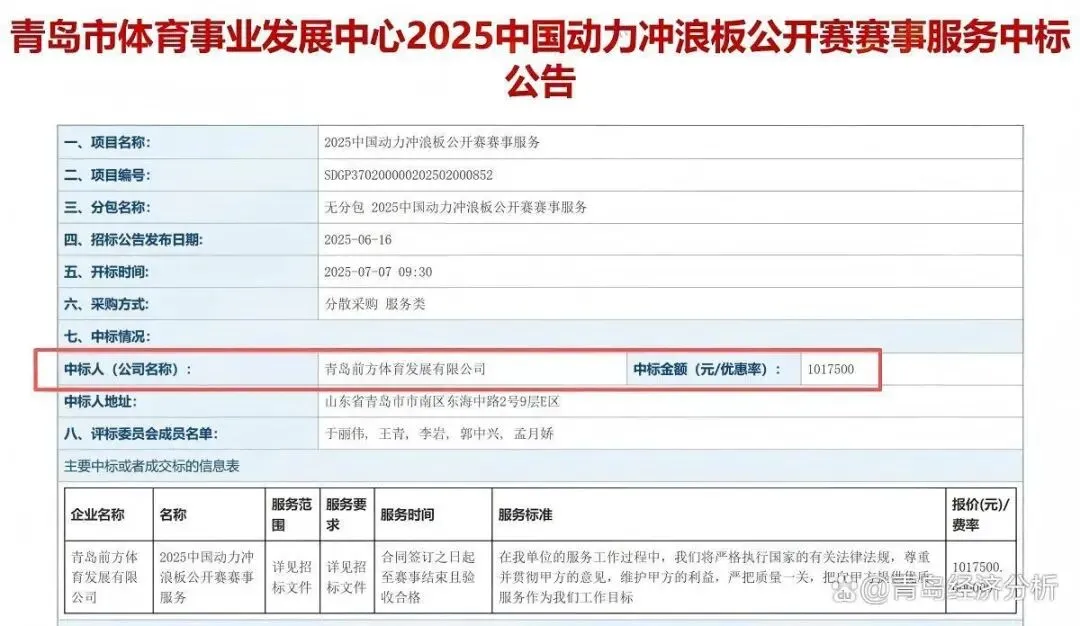 值得关注的是,尽管存在欠税情况,青岛前方体育发展有限公司近期仍多次中标政府招标采购项目。仅2026年1月28日披露的信息显示,该公司已中标2025青岛市第五届社区运动会策划组织服务、2025中国动力冲浪板公开赛赛事服务、2025中国摩托艇公开赛赛事服务等项目,并于1月21日与青岛市市南区教育和体育局签订了2025年市南区全民健身赛事活动合同,上述项目总金额已超过500万元。