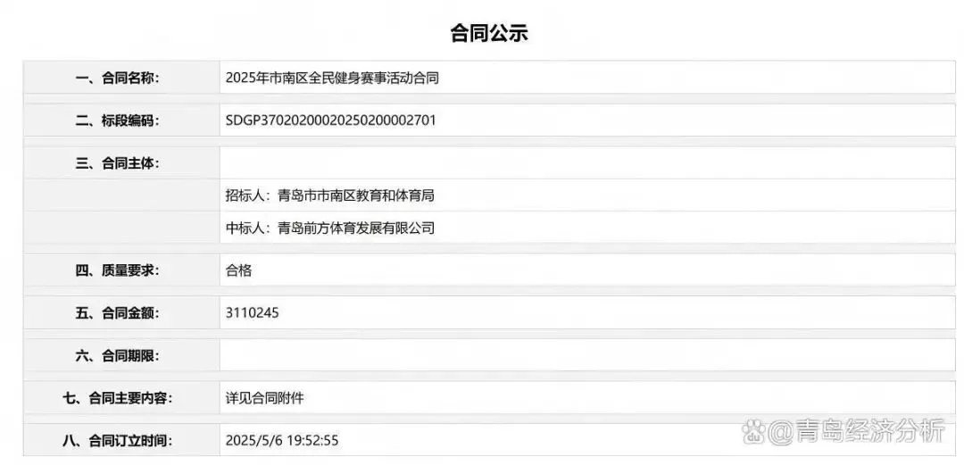 青岛市南城发体育有限公司同样在政府项目采购中表现活跃,已成功中标2025年市南区为民办实事全民健身设施采购项目、2025年即墨区承担第六届运动会赛事运营服务项目、2025年市南区体育场地调查服务及国民体质监测服务项目等,合同总额逾100万元。