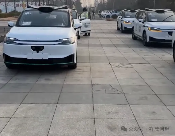 青岛轨道交通产业示范区管委门前有多辆“萝卜快跑”无人网约车聚集