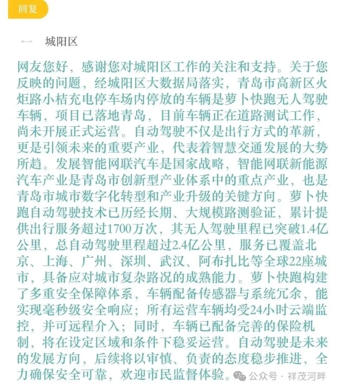此前,针对“萝卜快跑”登录青岛的消息,城阳区官方也曾给出权威回应: