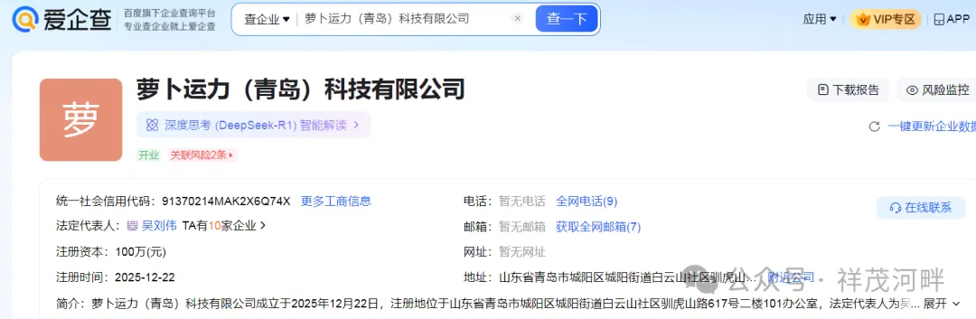 爱企查显示,萝卜运力(青岛)科技有限公司于2025年12月22日成立,注册资本100万元 ,注册地位于青岛市城阳区城阳街道白云山社区驯虎山路。该公司由萝卜运力(北京)科技有限公司全资控股。