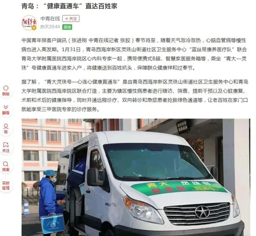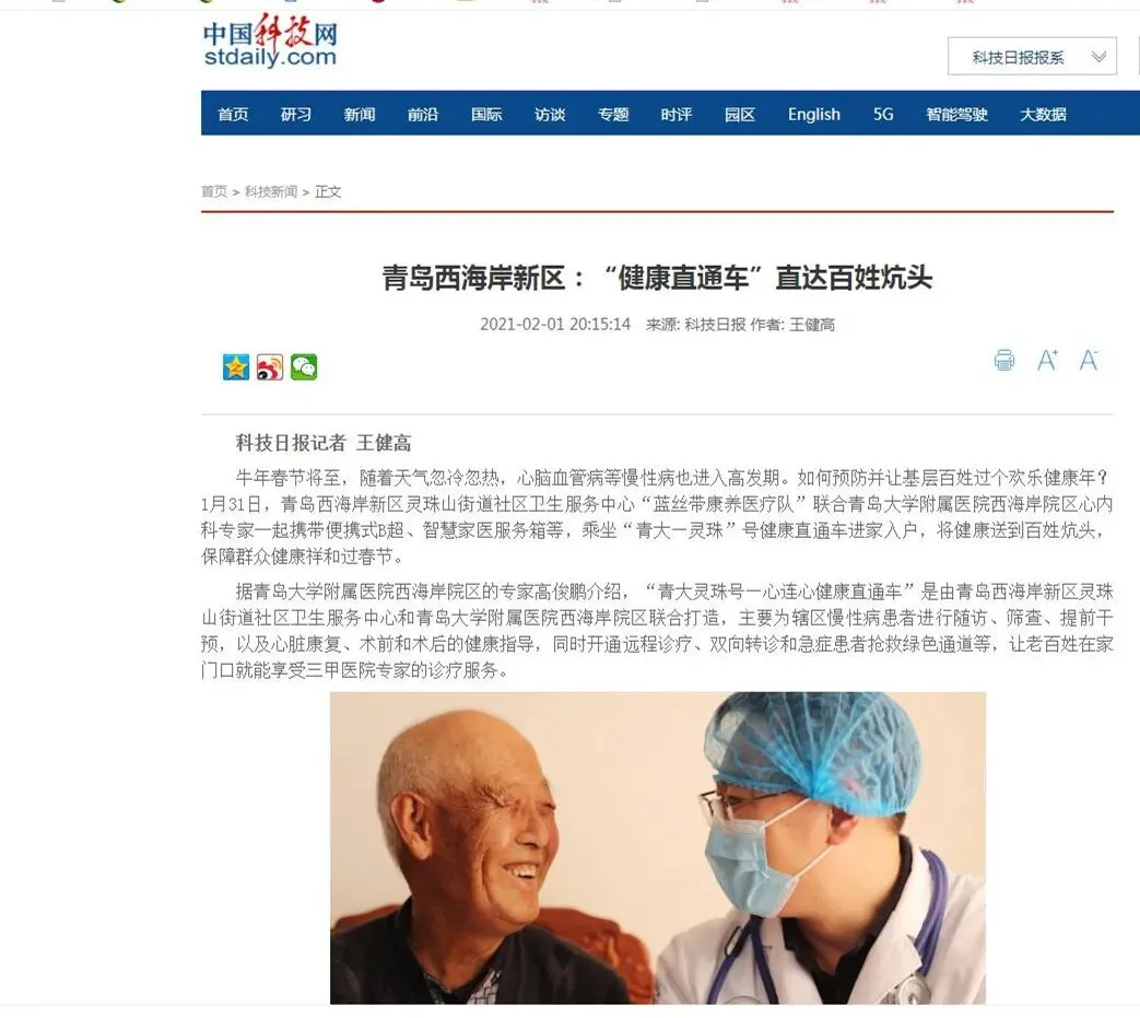 “蓝丝带”服务品牌队伍先后在学习强国、人口健康报、大众网、青岛日报、青岛早报、青岛电视台、西海岸新闻、西海岸传媒、青岛西海岸报等30余家权威媒体报道。其中,灵珠山“蓝丝带康养服务队”联合青岛大学附属医院西海岸院区心内科专家一起携带便携式B超、智慧家医服务箱等,乘坐“青大—灵珠”号健康直通车进家入户,将健康送到百姓炕头的新闻信息,被CCTV央视网、人民日报、中国产经新闻、科技日报、中国青年报、光明网、大众日报、大众报业·齐鲁一点、观海、青岛电视台—蓝睛、中青在线等多家媒体广泛关注。