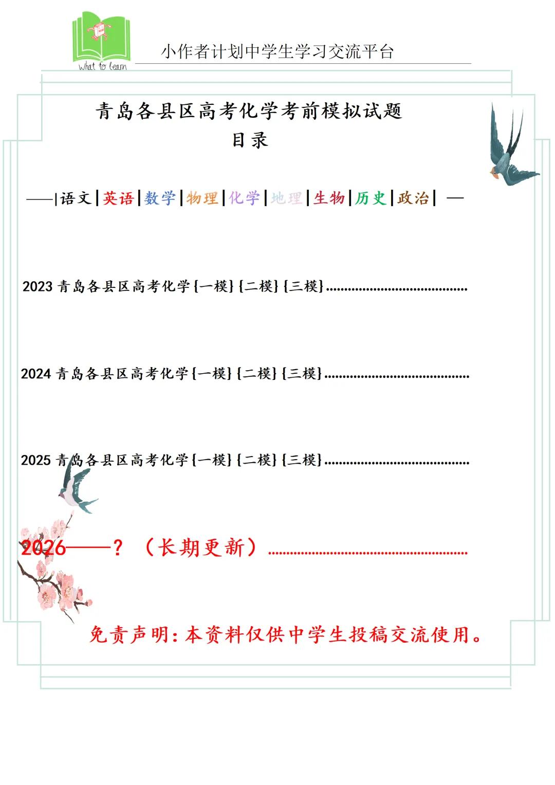 >青岛各县区高考化学一模、二模、三模试题及答案