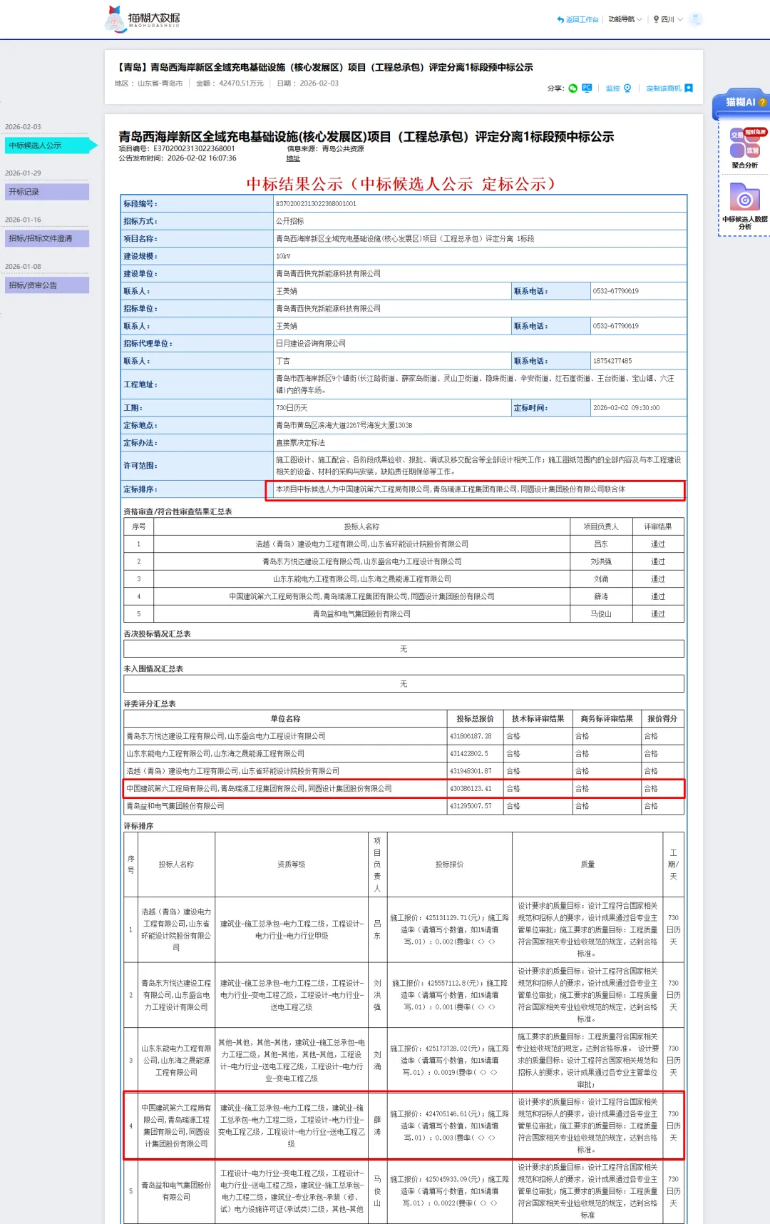 该项目于1月29日正式开标,共有5家投标人参与竞标,项目设定的最高限价为4.2598亿元。经过评审,中国建筑第六工程局有限公司、青岛瑞源工程集团有限公司、同圆设计集团股份有限公司联合体以4.3038亿元的报价成功中标。整个施工工期为730个日历天。