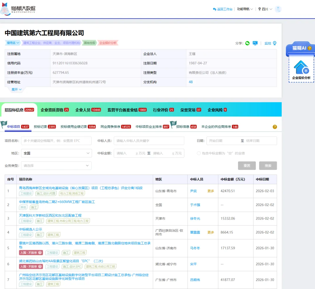 如果您想全面了解该中标人的中标记录,可以通过猫糊平台的“企业查询”来查看该企业所有的中标项目列表。