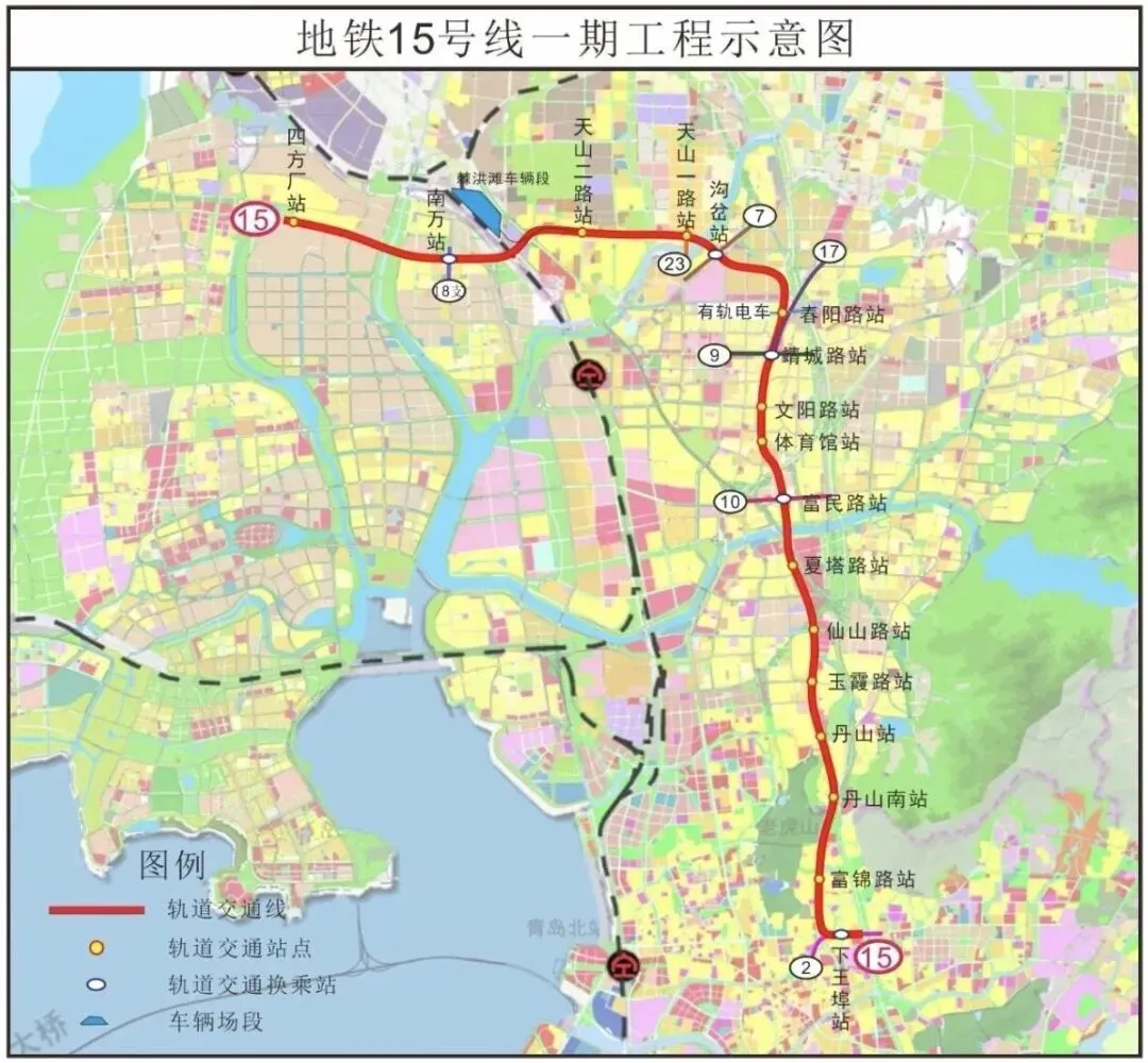 15号线一期主要服务黑龙江路沿线大型居住区、轨道交通产业示范区,实现东岸和北岸的快速联系。工程起于下王埠站,终到四方厂站,途经李沧、城阳、即墨三区,正线长约30.8公里,设车站17座,包括2座暗挖车站、15座明挖车站,设棘洪滩车辆段1座。