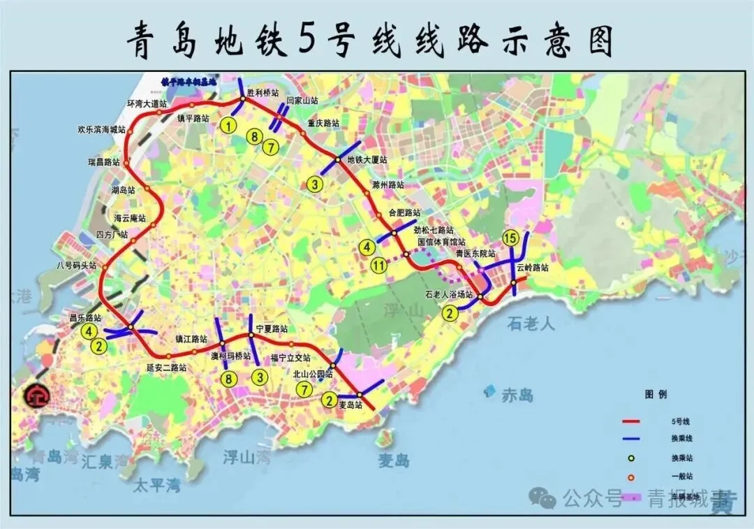 5号线是青岛地铁线网中具有环线功能的“C”型骨干线路,起于麦岛站,止于云岭路站,线路长约32.6公里,共设27座车站,串联8条地铁线路,连接市南区、市北区、崂山区,主要服务邮轮母港及老四方、浮山后等人口密集区。