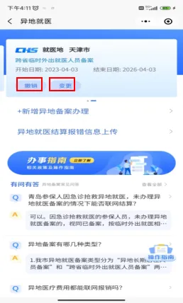 所以,青岛市参保人办理异地就医备案(尤其是长期备案)后,回青岛市长期居住的,要及时终止原异地就医备案;变更长期居住地的,要及时终止原异地就医备案,然后重新办理。临时备案人员可随时撤销或终止备案。长期备案人员在备案地发生费用的,6个月内不允许撤销备案;未在备案地发生费用可随时撤销备案。参保人可通过“青岛医疗保障”微信公众号自行申请变更备案,无需审批,具体操作如下: