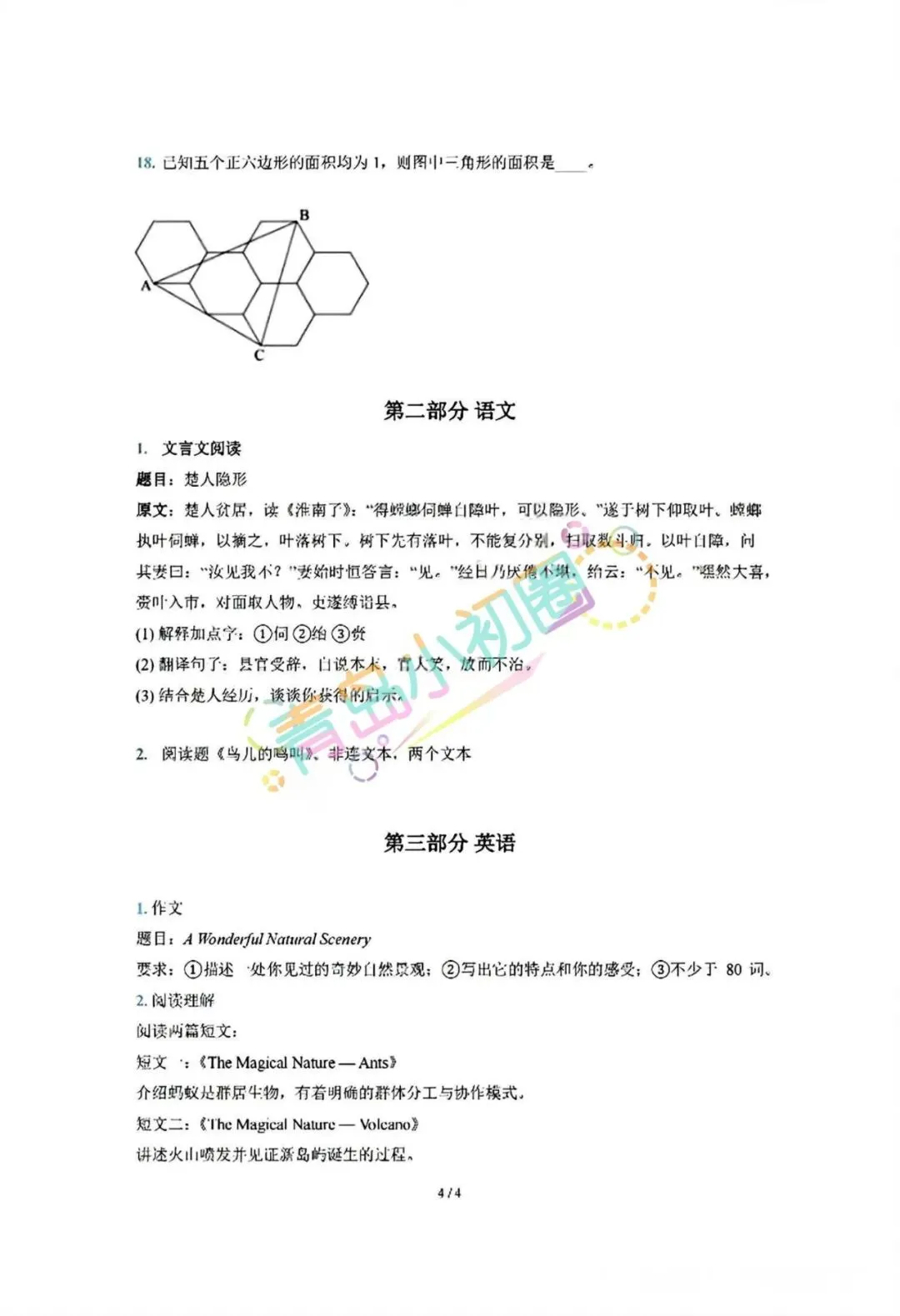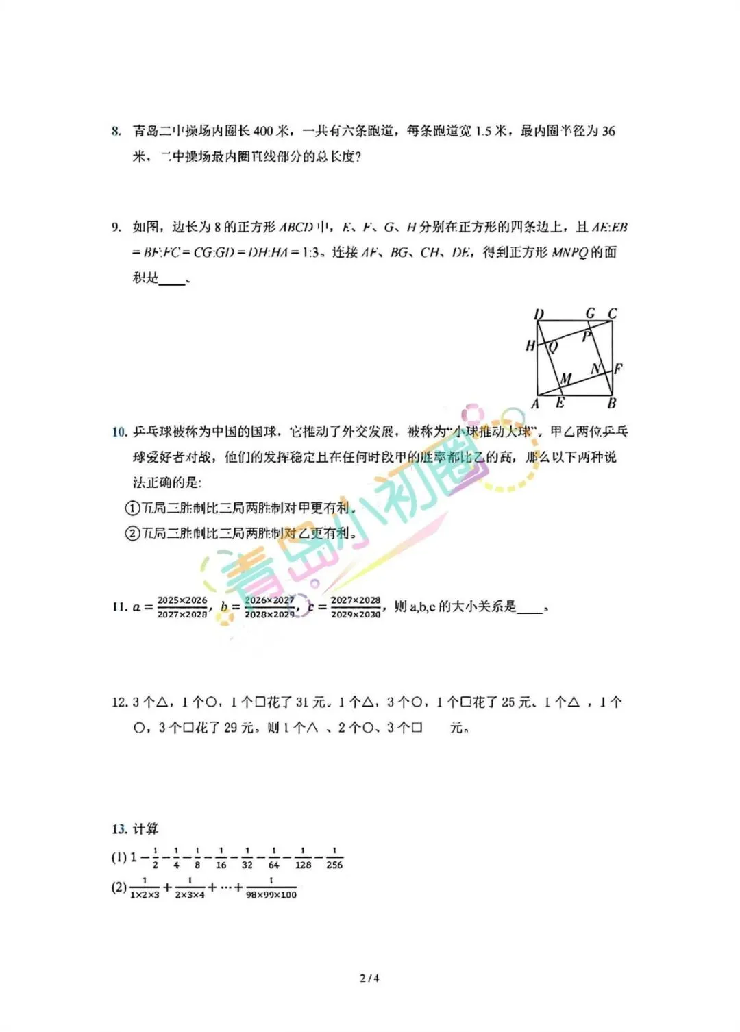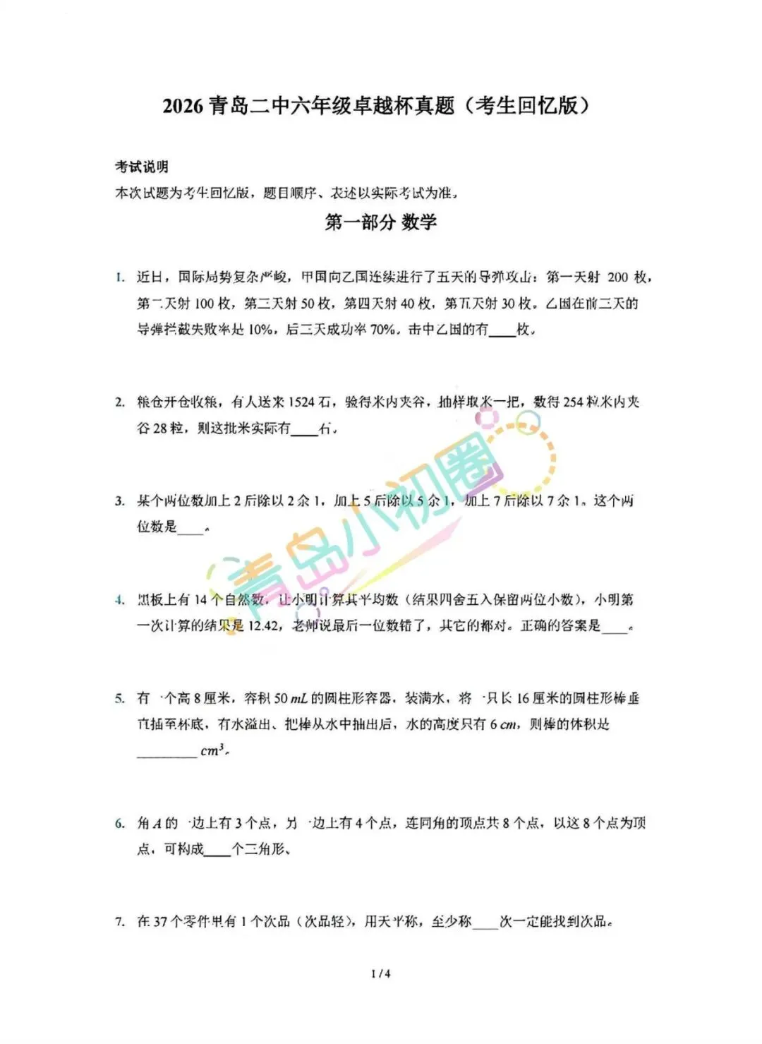 2026年青岛二中“山海卓越杯”六年级试题+答案(考生回忆版),含考情总结!