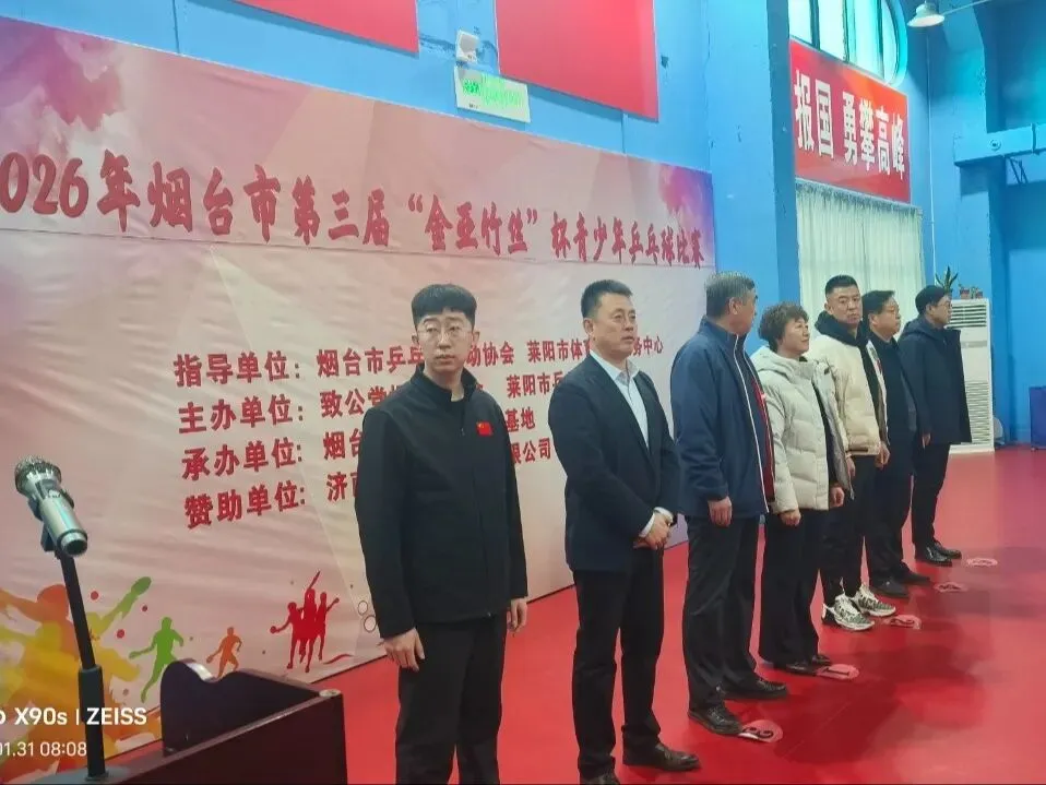 方寸球台显身手,青春赛场“乒”风采。1月31日,由致公党烟台市委会、莱阳市乒乓球运动协会联合举办的2026年烟台市第三届“金亚竹丝杯”青少年乒乓球邀请赛在莱阳市拉开战幕,来自全省多地的乒乓球爱好者齐聚于此,共同见证这一青少年乒乓球赛事的开启。致公党莱阳支部副主委、莱阳市乒乓协会主席、山东供销农业服务集团鲁东有限公司副总经理于波参加活动。