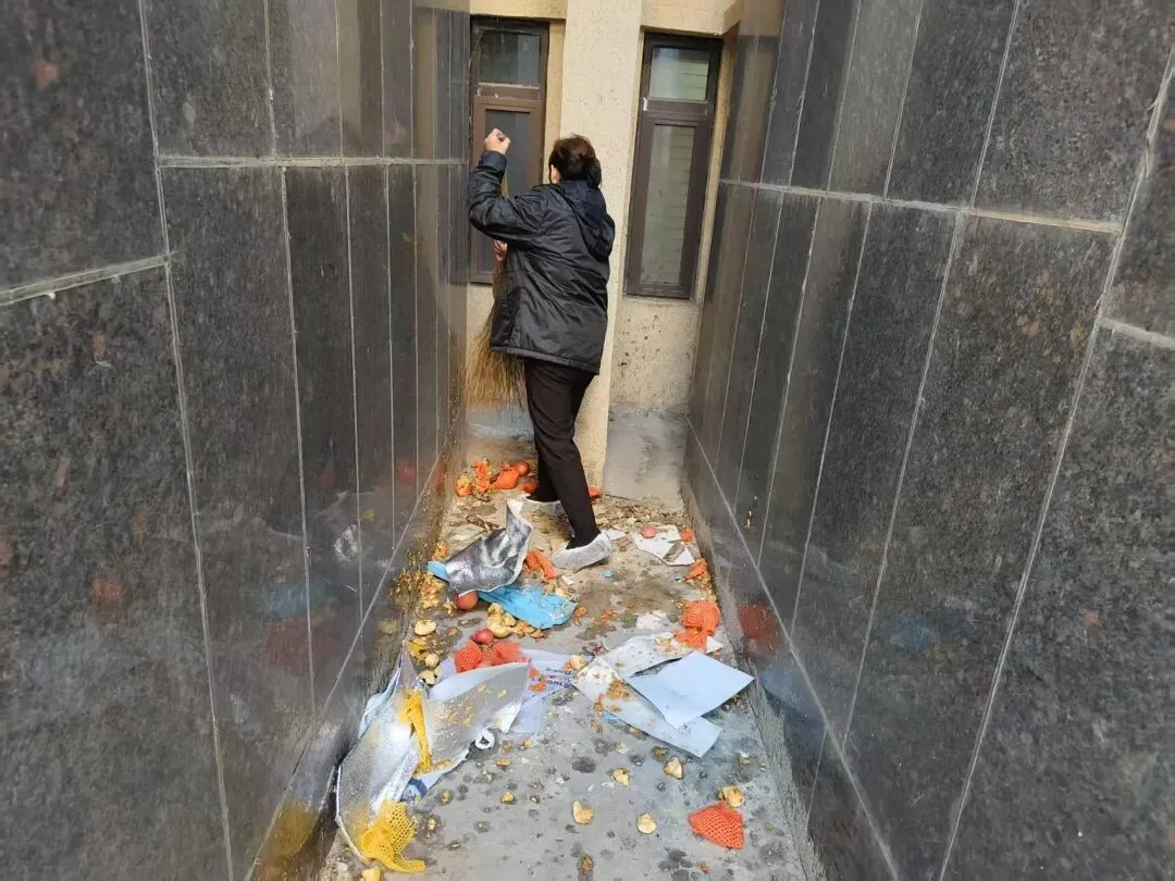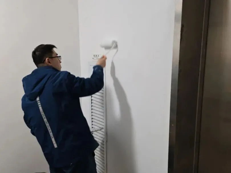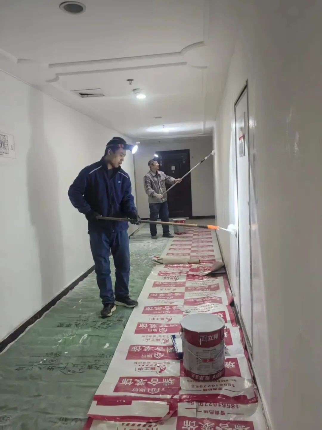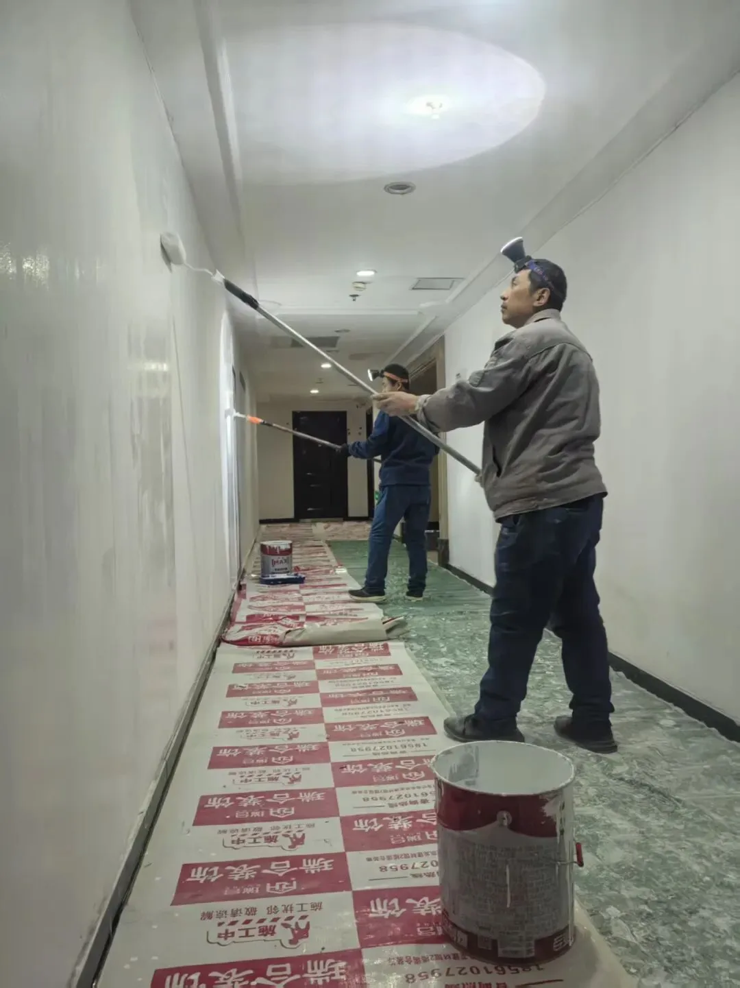7、写字楼标准层每日巡检发现的顶面、墙面受损问题修复刷漆,修复面积约50余平米,对消防通道墙面破损处进行修补,走廊污染位置刷漆翻新。对写字楼货梯间墙面污染位置进行刷漆修复