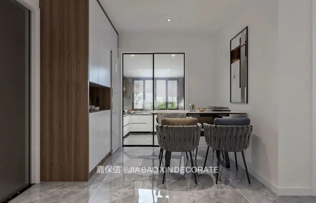 厨房与餐厅之间以长虹玻璃门为隔断,透光不透烟火气。白色橱柜与餐边柜、灰色墙砖、大理石地砖形成和谐的色彩碰撞。岩板餐桌搭配绒面编织餐椅,质感高级、坐感舒适。墙面点缀的艺术画作,开启艺术与生活的和谐对话。无主灯设计营造出均匀柔和的光影氛围,体现出现代风格的简约与精致。