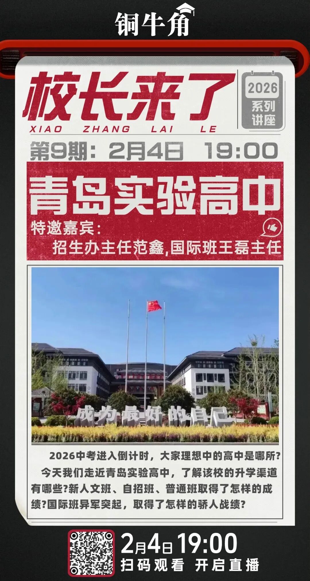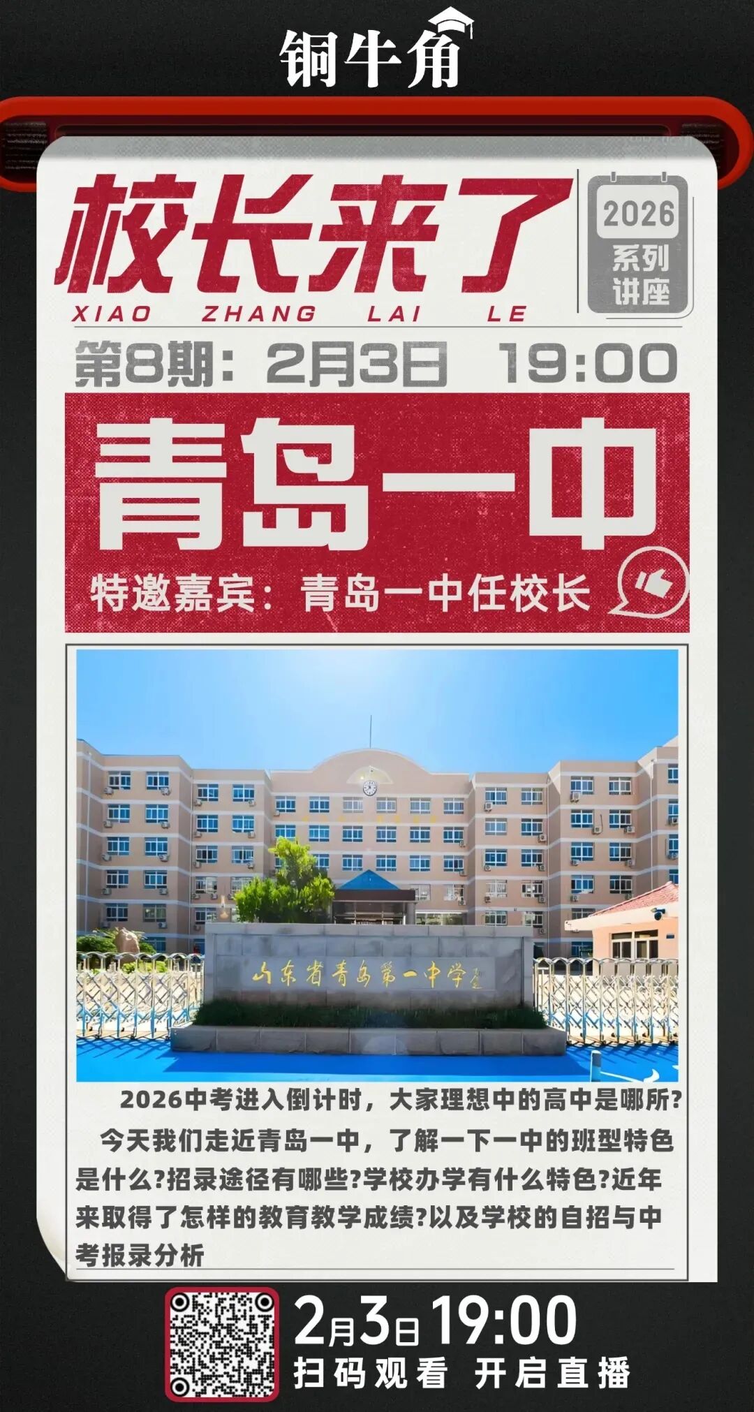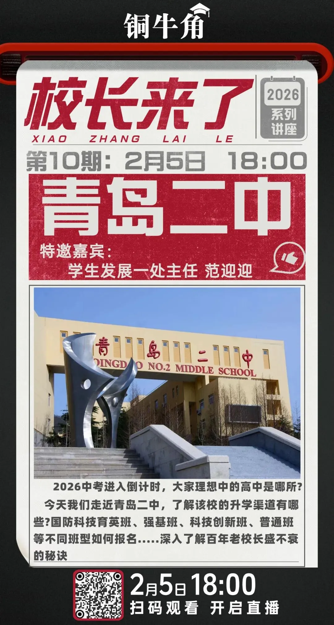 2026年中考进入倒计时,铜牛角邀请如下学校招生负责人进入直播间,欢迎大家关注: