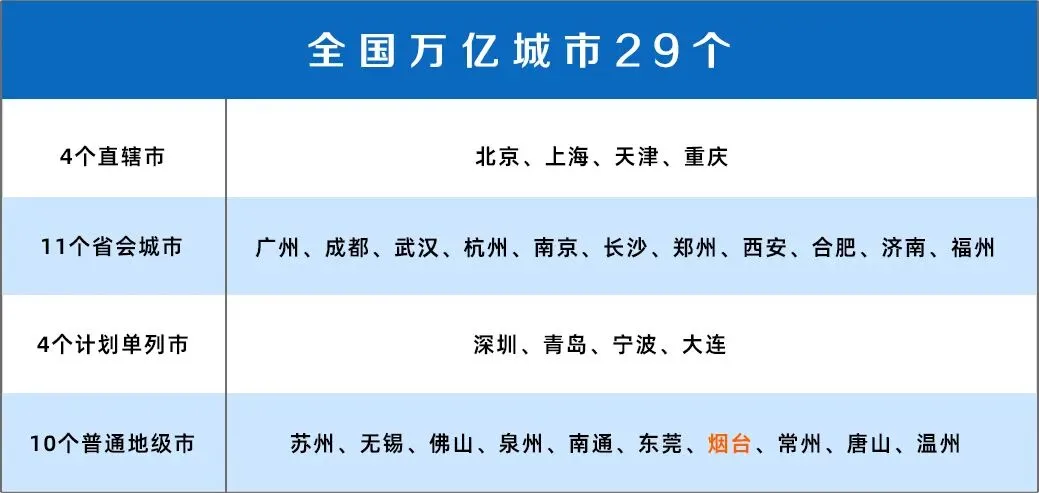 至此,全国万亿城市总计29座。其中,4个直辖市、11个省会城市、4个计划单列市、10个普通地级市。