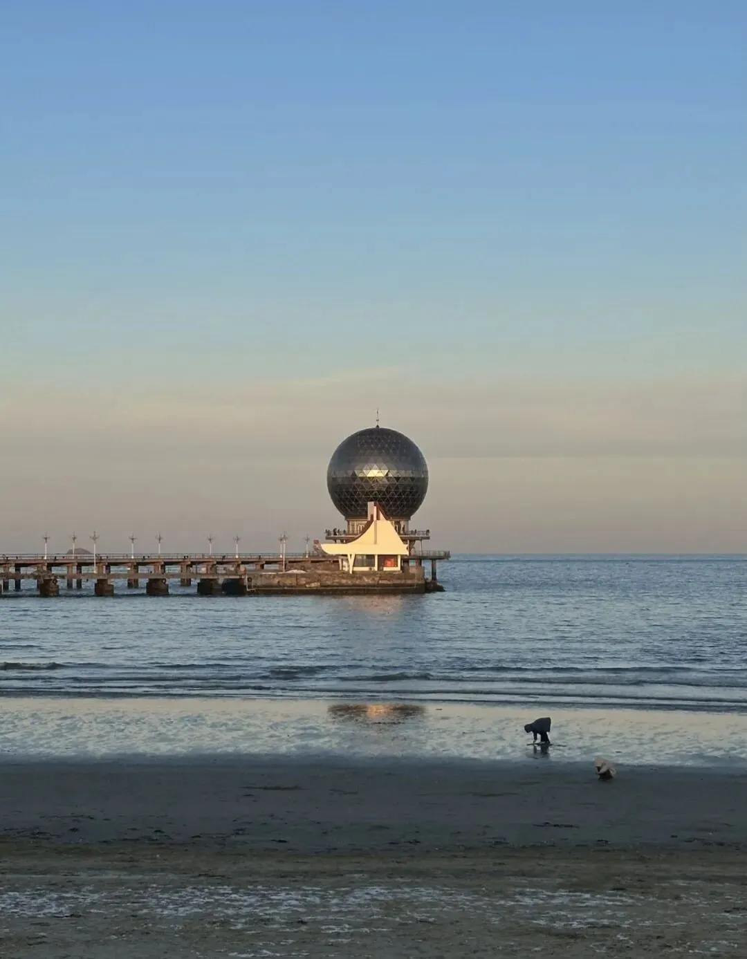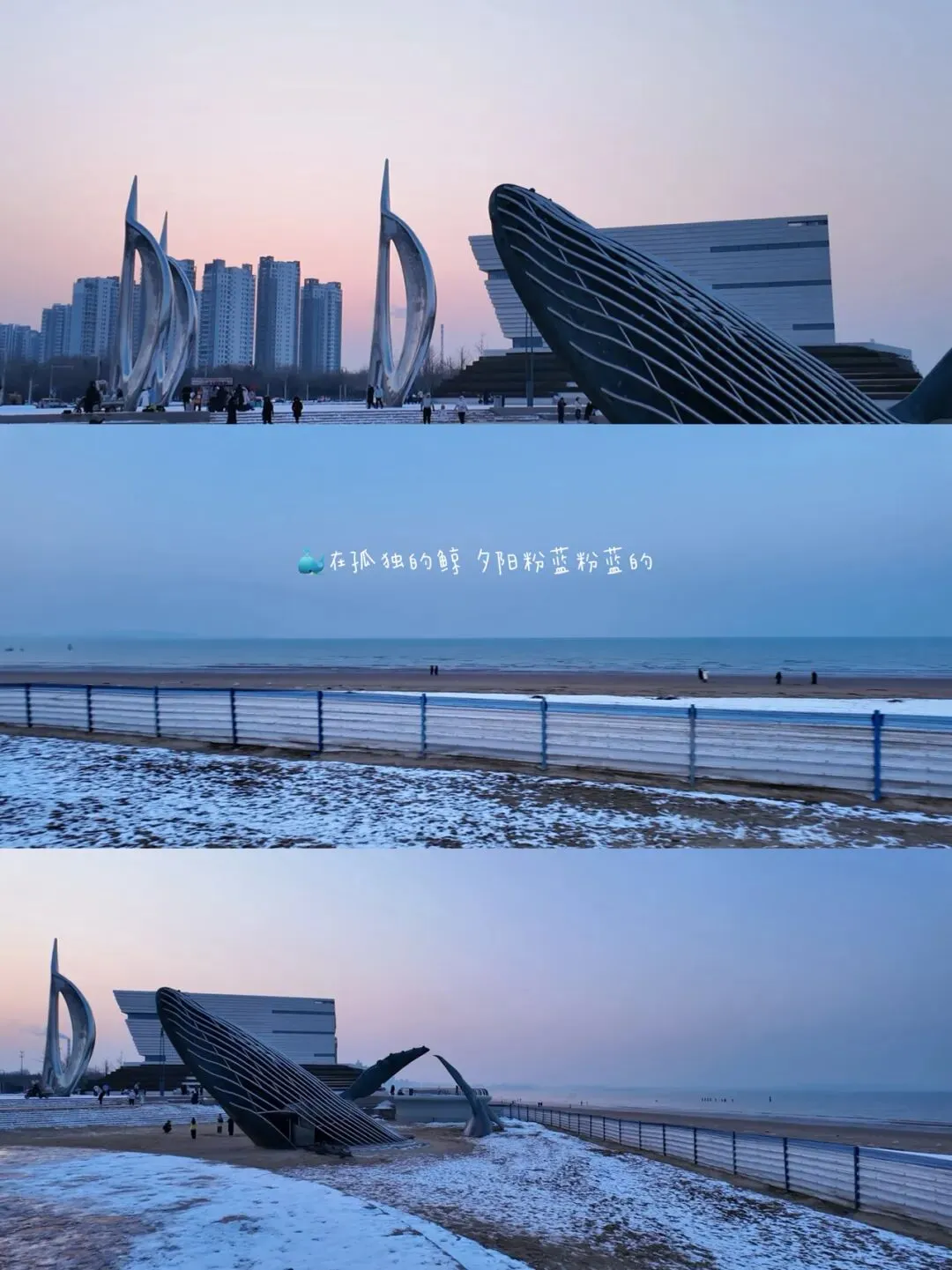🐳在烟台的第三站来到“孤独的鲸”。这是一座巨大的鲸鱼雕塑,矗立于沙滩之上。在日落时分来到这里,遇见了粉蓝粉蓝的夕阳。