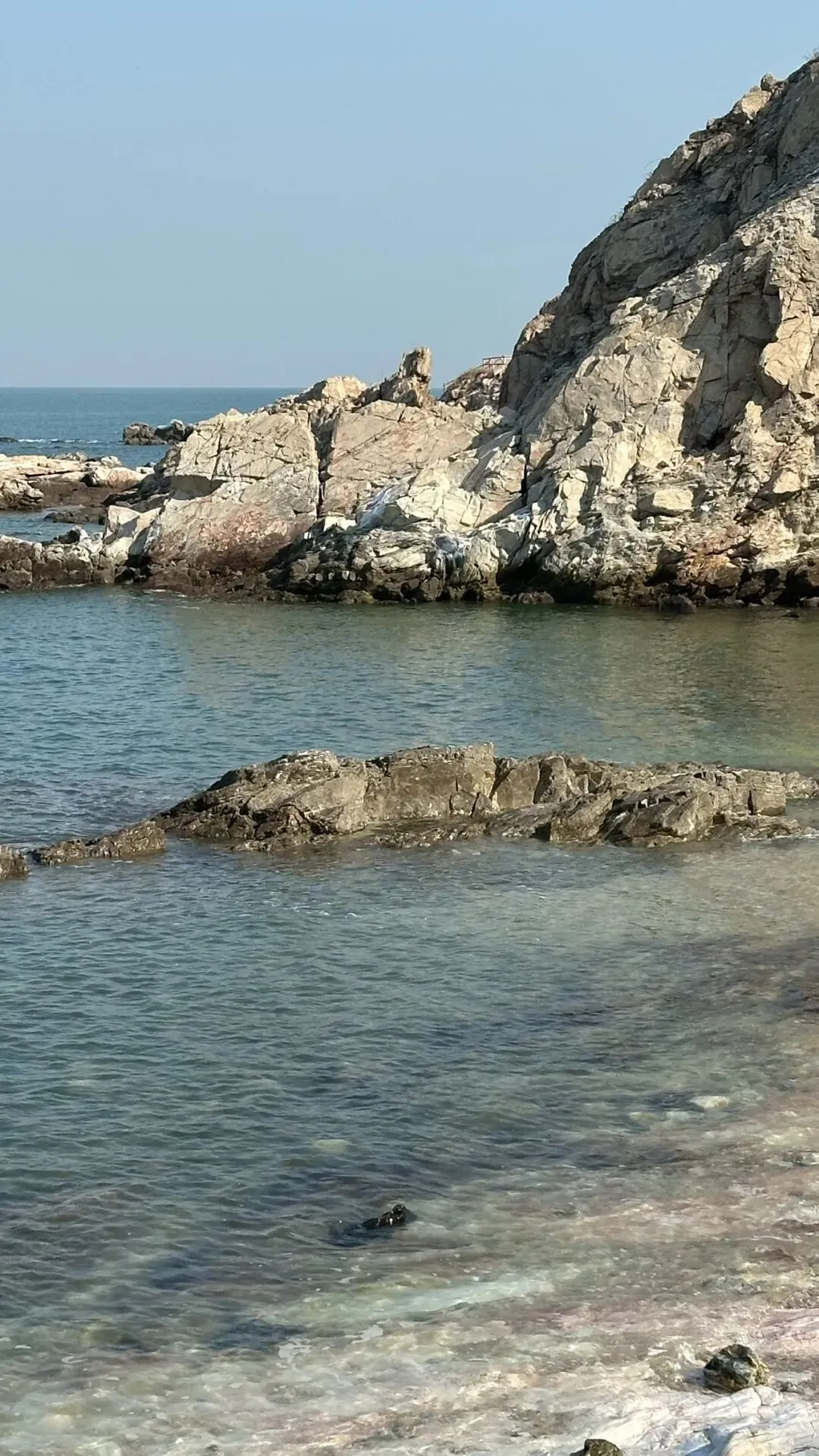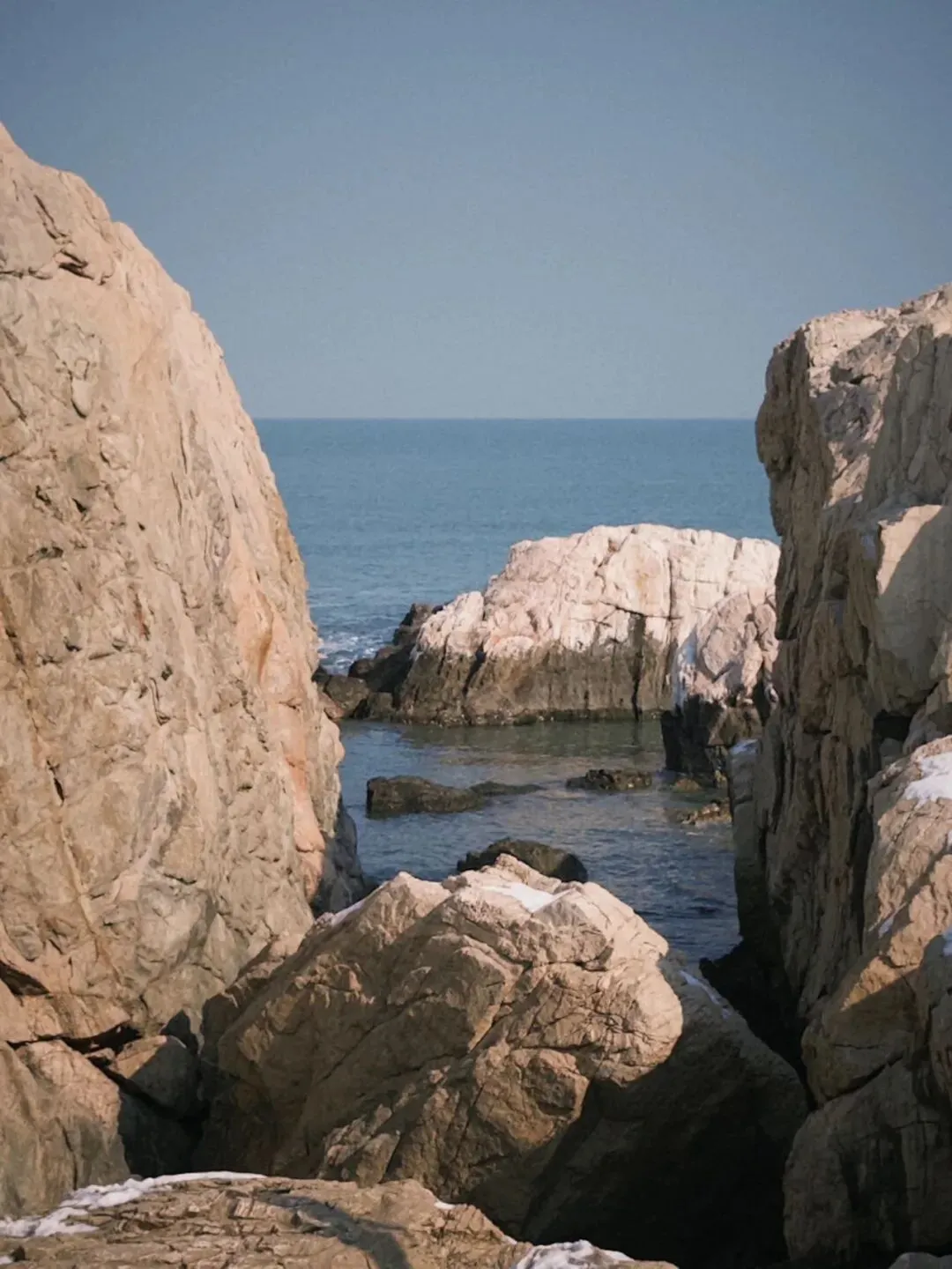 离开獐岛后又随意去了几处海滩欣赏海景,虽然叫不出确切的地点,但都是随意走走就很舒服的地方。悬崖下的积雪还很厚实,岸边澄澈的海水伸着懒腰似的游离在砾石滩上。倚在围栏上看着自己的影子融在海水之中上下起伏着,