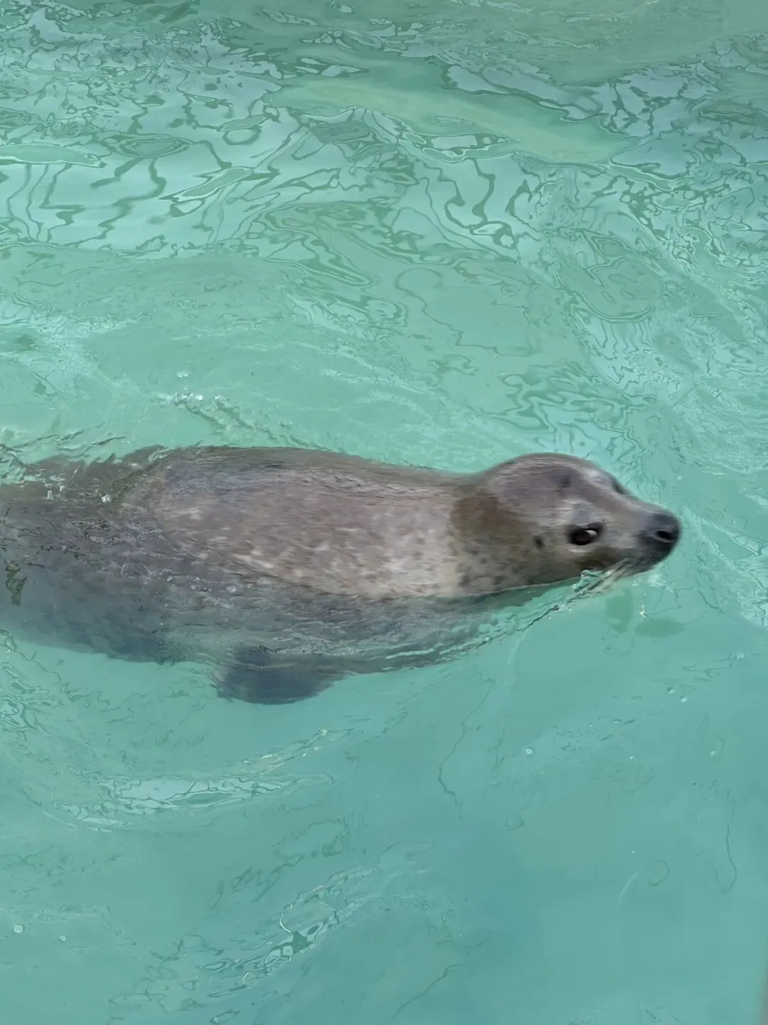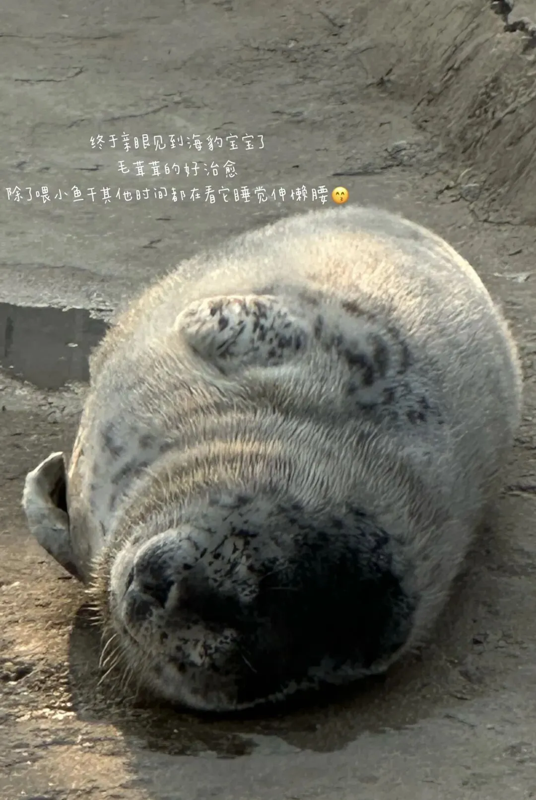 🦭在烟台的第四站来到东炮台海豹保育园。据说烟台是海豹生活最南端的城市,保育园里住着一群斑海豹,生活区域连通着自然海水。很幸运的是这次去看到了刚出生二十天左右的海豹宝宝,滚圆的小脑袋上有一双水灵灵的大眼睛,大半个身子的白色绒毛还没有褪去,毛茸茸的很可爱。海豹宝宝还不会游泳,只能在岸上晒晒太阳,伸伸懒腰,有时张开尾巴变成一只“美人鱼”,有时收紧尾巴变成一只“天妇罗炸虾”,然后打量打量我们这些发游客,奇怪我们为什么时常发出一些惊奇的“哇哇”声。海豹妈妈很警惕,经常会游来照顾海豹宝宝,给它喂食,生怕我们这些围观的游客会把孩子给“偷走了”。