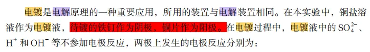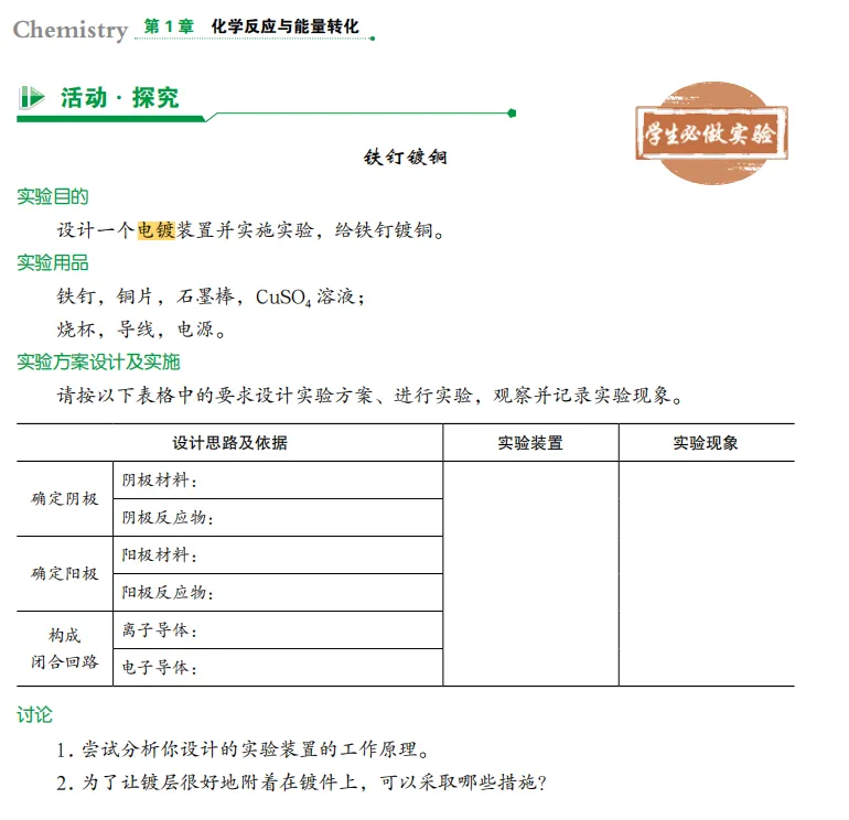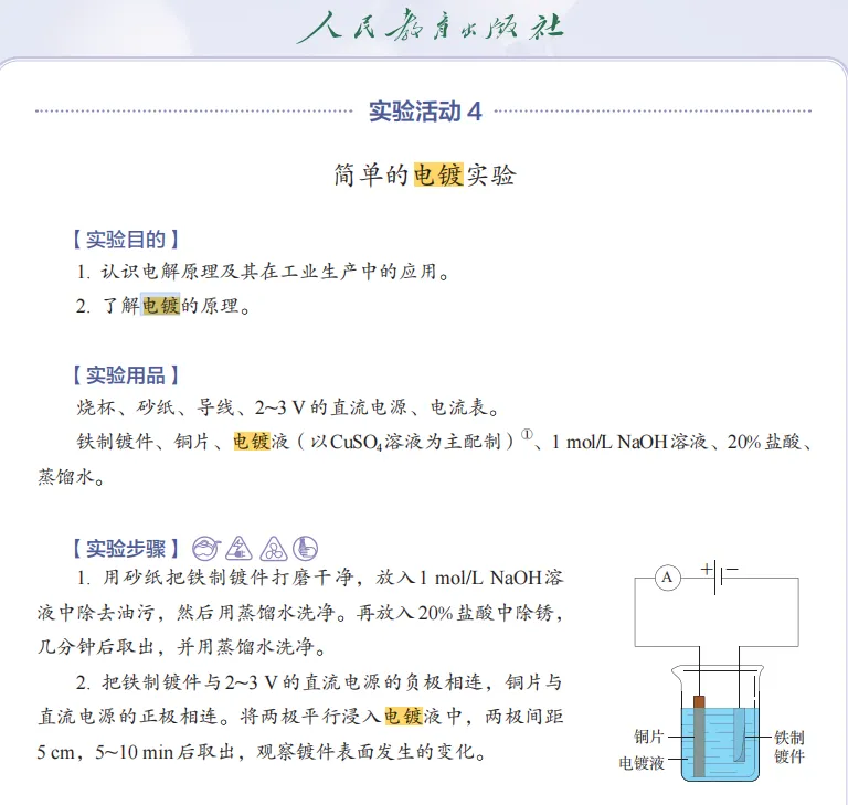 【电镀】鲁科版作为必考实验以设计形式呈现在课本中,没有给最后答案,根据文字表述,考题中铜片和铁片位置错误。人教版图和文字都配好了。