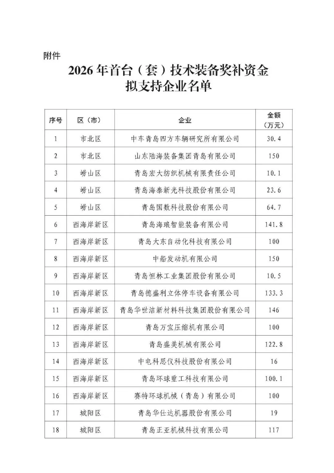 当前位置:首页>青岛>青岛:关于2026年首台(套)技术装备奖补资金拟支持企业名单的公示