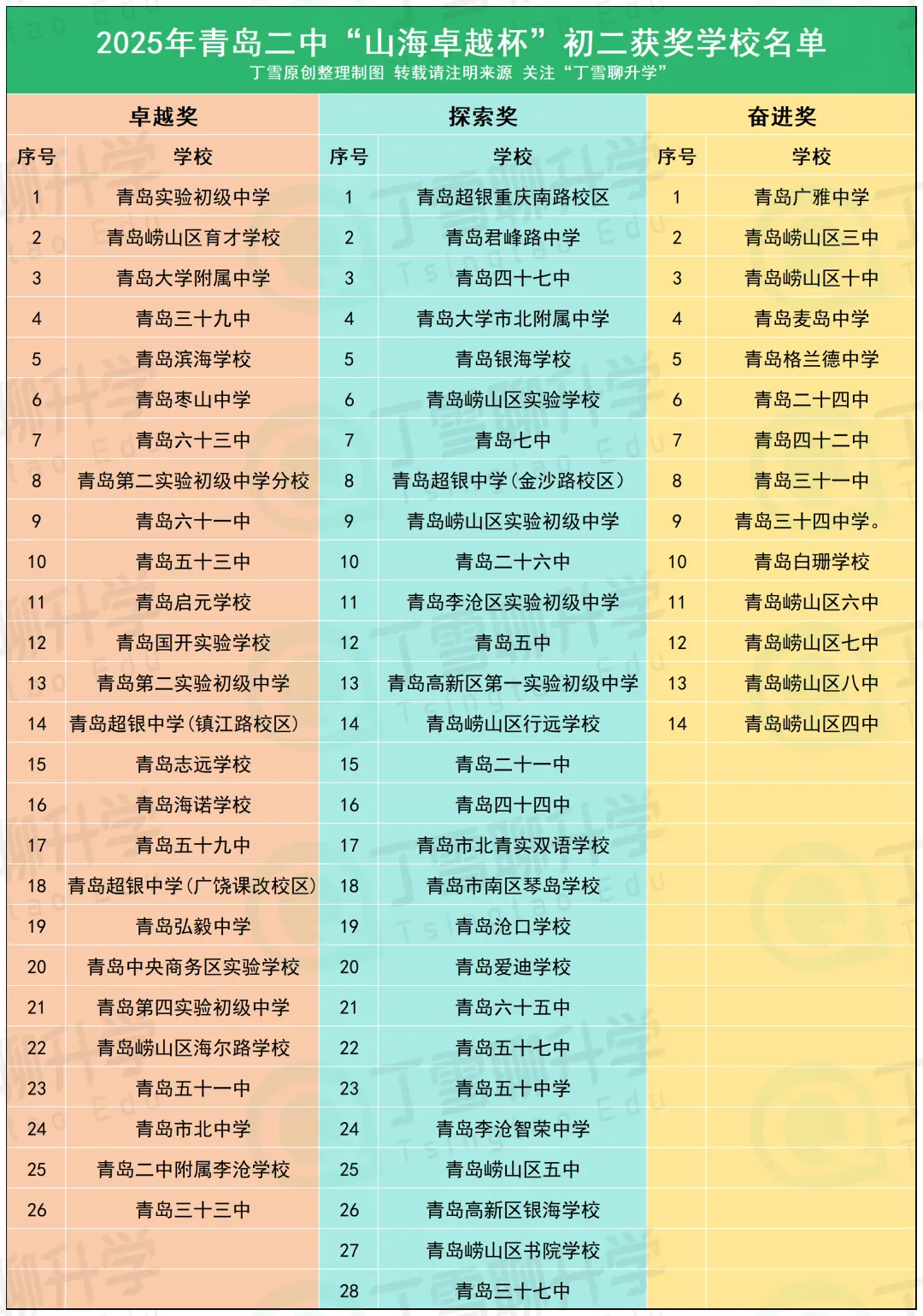 1、团体奖:根据家长分享,卓越奖26所初中,探索奖28所初中,奋进奖14所初中。