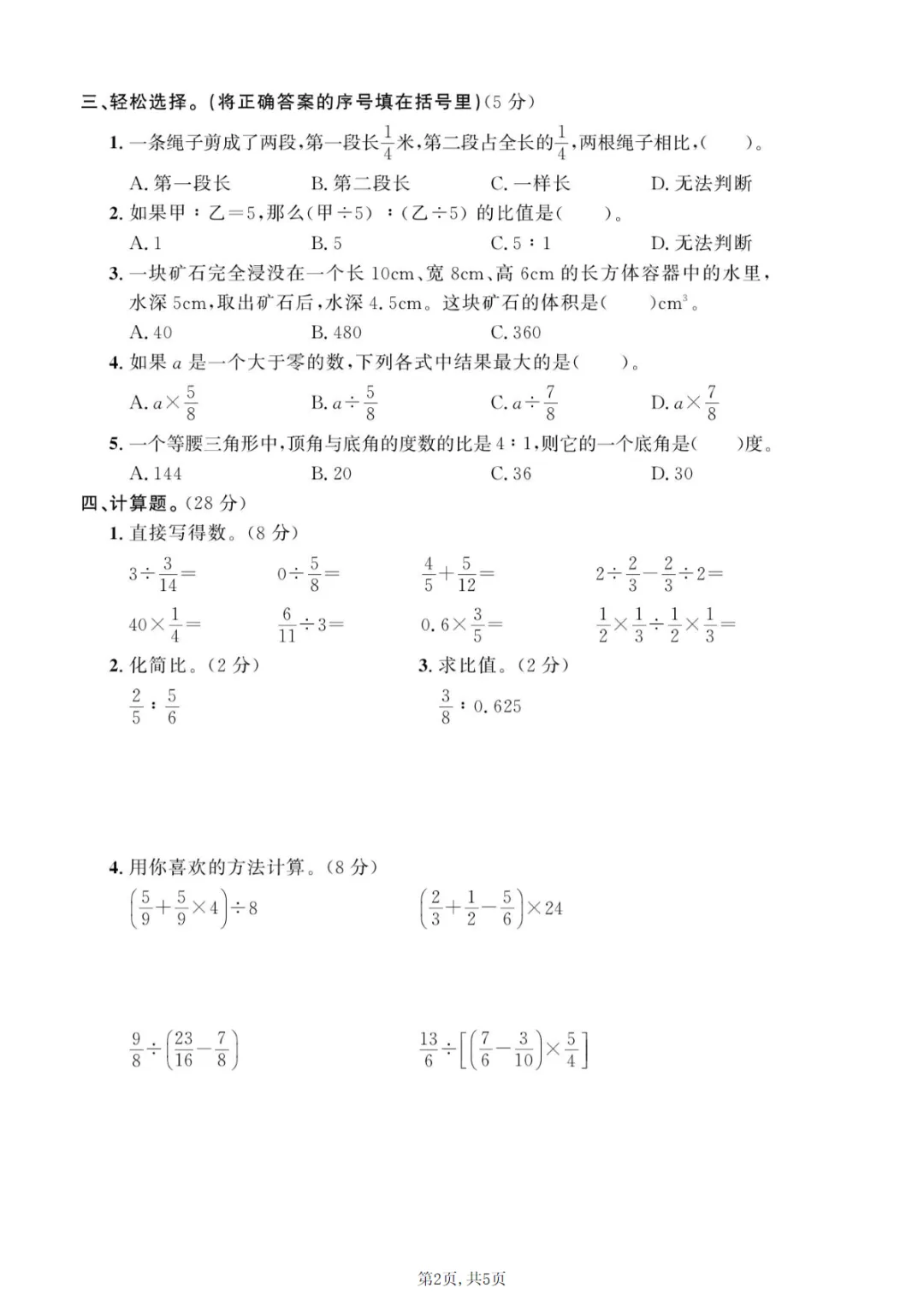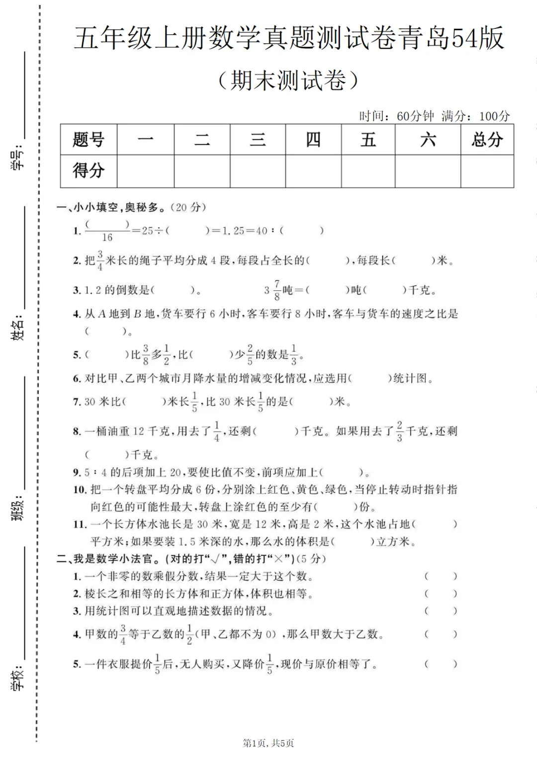 >【免费下载】五年级上数学期末测试卷2《青岛54版》,PDF电子版,可打印