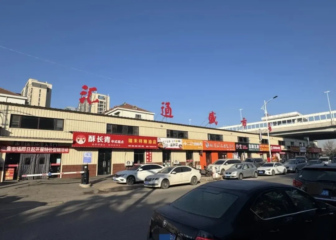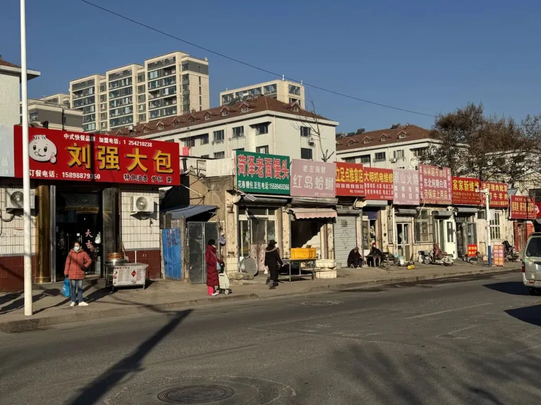 市场南面沿街也有许多店铺,刘强大包、菏泽老面馒头、红岛蛤蜊、泰山火烧。