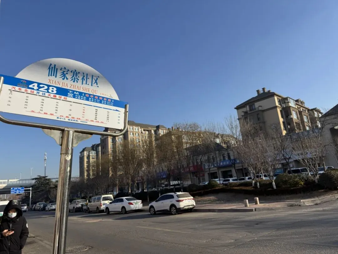 公交站旁边,南流路西侧是仙家寨村2小区,东侧是仙家寨馨苑小区。仙家寨馨苑很大,分有A区、B区,以及建设中的C区。