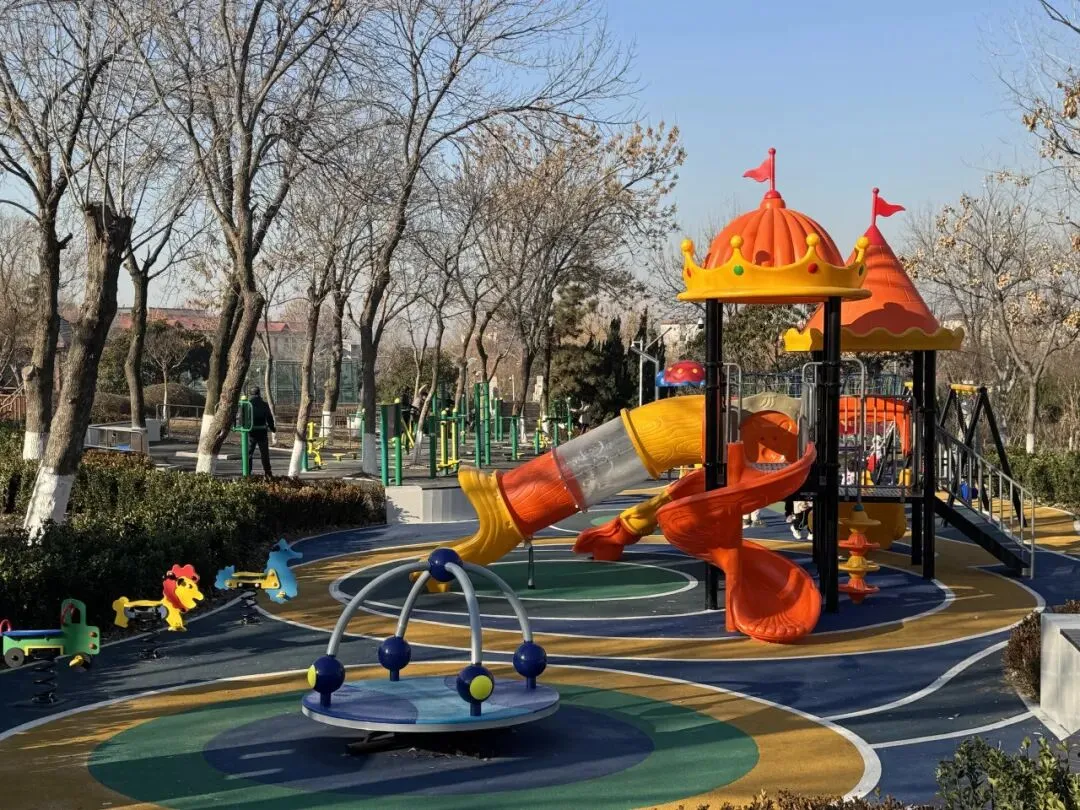 公园内色彩靓丽的儿童游乐场,有滑梯及其他儿童玩乐设施。