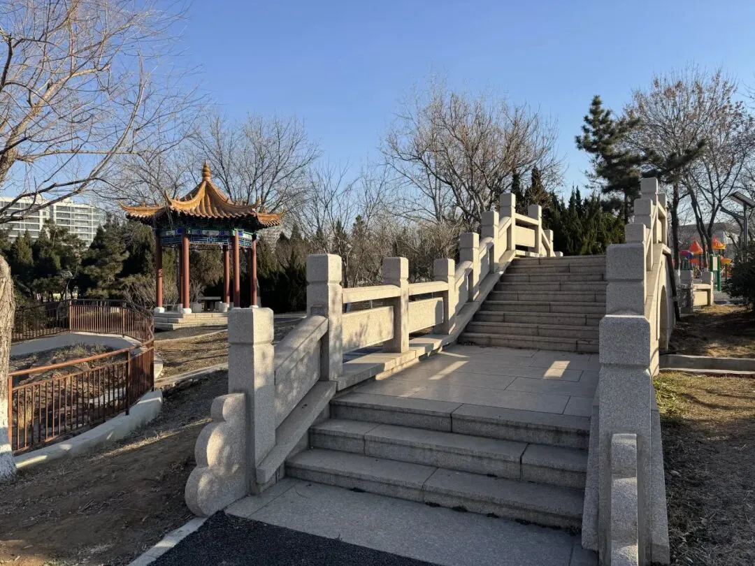 走在园内,既能看到现代气息也能感受到古典韵味。又看到一座美丽的古式亭子,旁边一座石桥。