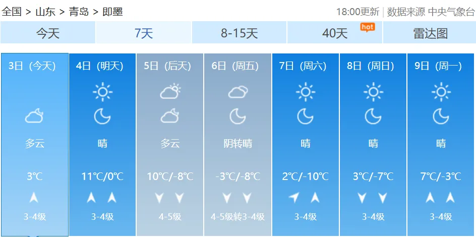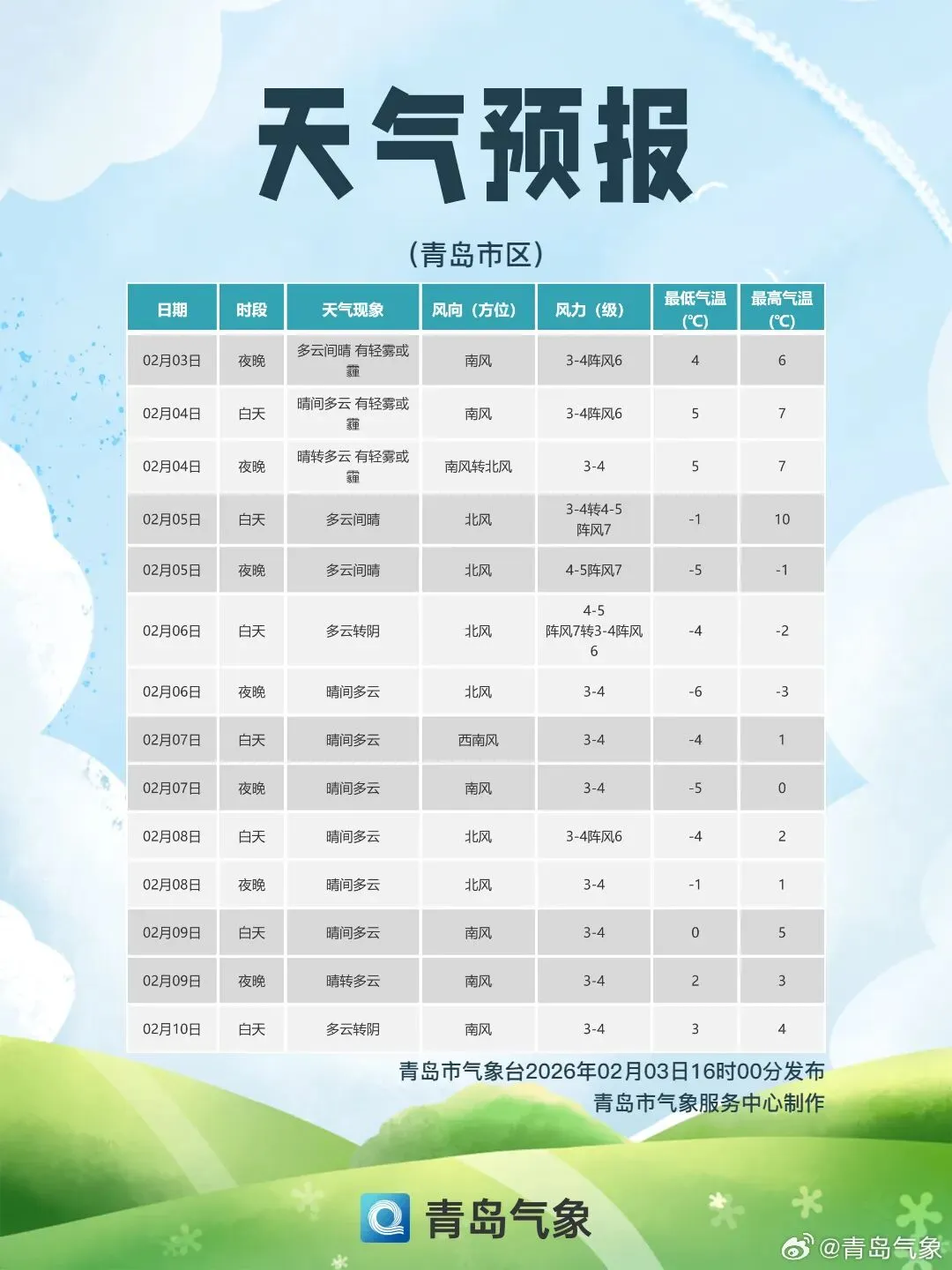 2月4日白天,天空晴朗,仍有轻雾或霾,能见度不佳,外出的朋友要注意路况,并做好防护。4日沿海地区的气温变化不大,内陆地区的气温会进一步上升到11℃。4日是立春节气,今年的立春将会在温暖中开场。不过,5日上午开始,将会有冷空气自北向南影响我市,北风逐渐增大,气温开始下降。到了6日早晨,我市最低气温会快速下降到-9℃~-5℃之间。6日白天,各区市的最高气温也都在0℃以下,气温波动剧烈,请关注天气变化,及时调整着装。5日随着冷空气的到来,近期持续的雾和霾天气将会减弱消散。【青岛市区】今天白天,晴间多云,有轻雾或霾,南风3到4级阵风6级,今天夜间,多云间晴,有轻雾或霾,南风转北风3到4级,今天最高气温8℃,最低气温3℃,相对湿度60%-90%。5日白天到夜间:多云间晴,北风3到4级转4到5级阵风7级,-4到11℃。6日白天到夜间:多云间阴,北风4到5级阵风7级转3到4级,-6到-4℃。【预报各区】今天白天到夜间,晴转多云,有轻雾或霾,南风转北风,海上5到6级,内陆3到4级阵风6级。5日白天到夜间:多云间晴,北风3到4级转4到5级阵风7级。6日白天到夜间:多云间阴,北风4到5级阵风7级转3到4级。转发提醒