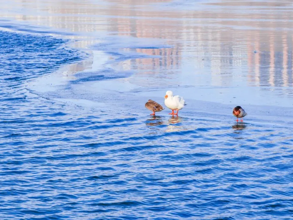 第三个五日,河里的冰开始融化,鱼类由于水温的升高,会上升到水面上游动。此时水面上可能还会有一些没有完全融化的碎冰片,好像是被鱼背负着浮在水面。