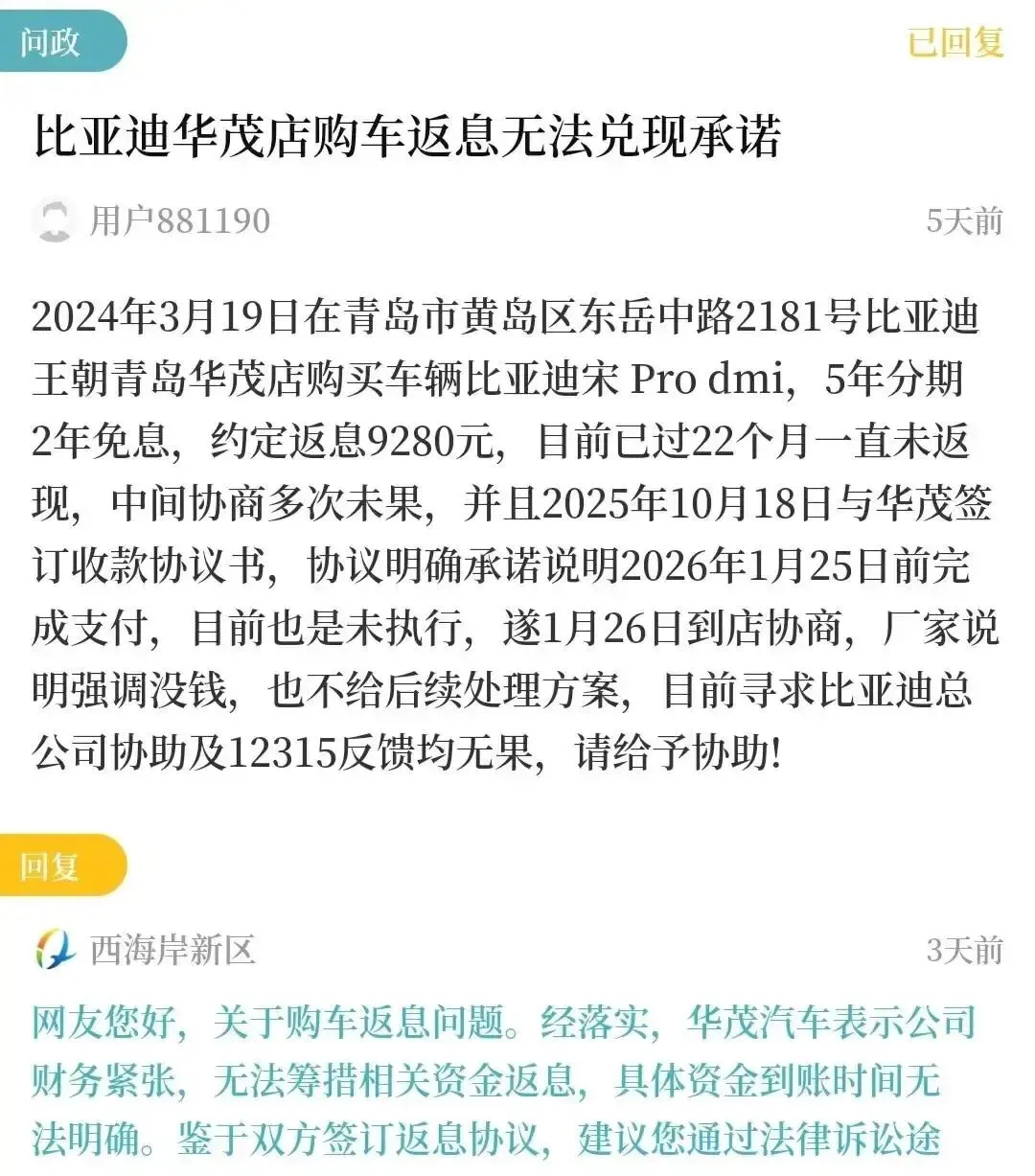 去年3月,他在比亚迪华茂店提了辆宋Pro DMi,销售拍着胸脯保证:“返息9280,签完协议下个月到账!”结果呢?2025年10月签了协议,写明2026年1月25日前打款,结果2月3号了,屁都没见。他催了十几次,店家回话永远一样:“钱在周转,等一等。”连比亚迪总部和12315都打了,得到的只有“建议走法律途径”的冰冷回复。
