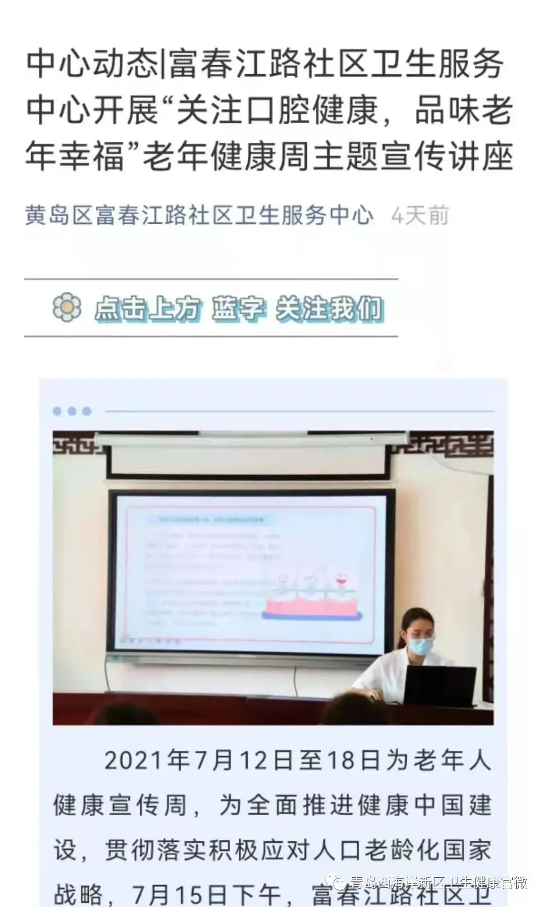 三是该中心健康宣讲团及文明实践志愿者,定期联合街道、社区和企业开展健康大讲堂和特色义诊服务,将“未病先治”理念融入医养结合,为签约居民提供全过程的健康保健、医疗康复、专业护理、心理咨询等技术指导及健康服务;四是加强线上宣传,便捷服务居民。利用其公众号、微信群和信息化“智呼”系统等方式,普及宣教疫情防控科普知识,为居民解疑释惑、疏导心理,帮助居民科学防护,携手齐心共同抗疫,打造贴心、暖心、接地气社区卫生服务中心。